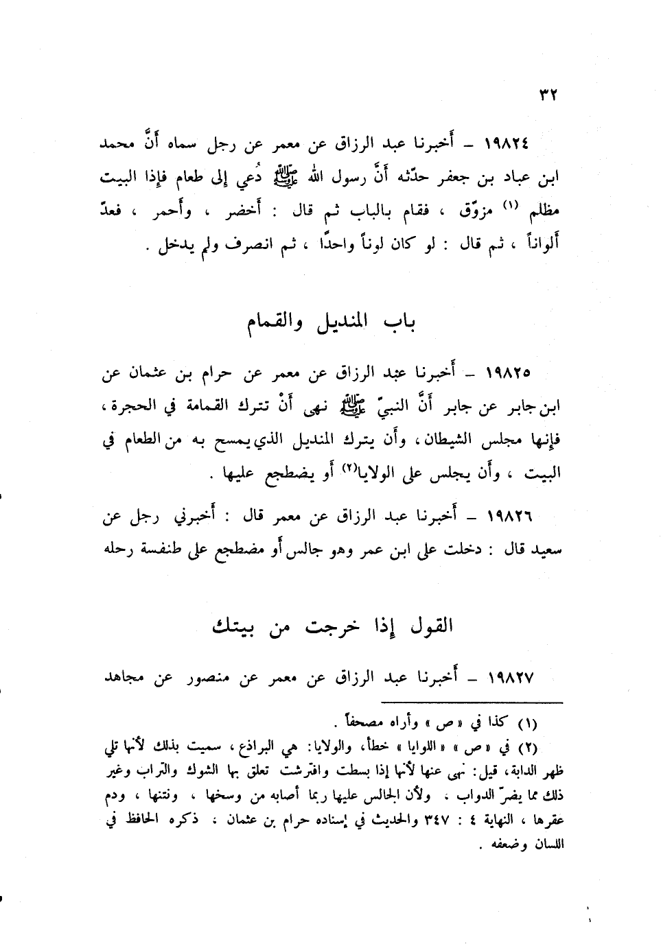 ١٩٨٢٥ - أَخْبَرَنَا عَبْدُ الرَّزَّاقِ، عَنْ مَعْمَرٍ، عَنْ حَرَامِ بْنِ عُثْمَانَ، عَنِ ابْنِ جَابِرٍ، عَنْ جَابِرٍ، «أَنَّ النَّبِيَّ صَلَّى اللهُ عَلَيْهِ وَسَلَّمَ نَهَى أَنْ تُتْرَكَ الْقُمَامَةُ فِي الْحُجْرَةِ، فَإِنَّهَا مَجْلِسُ الشَّيْطَانِ، وَأَنْ يُتْرَكَ الْمِنْدِيلُ الَّذِي يُمْسَحُ بِهِ مِنَ الطَّعَامِ فِي الْبَيْتِ، وَأَنْ يُجْلَسَ عَلَى الْوَلَايَا، أَوْ يُضْطَجَعَ عَلَيْهَا»