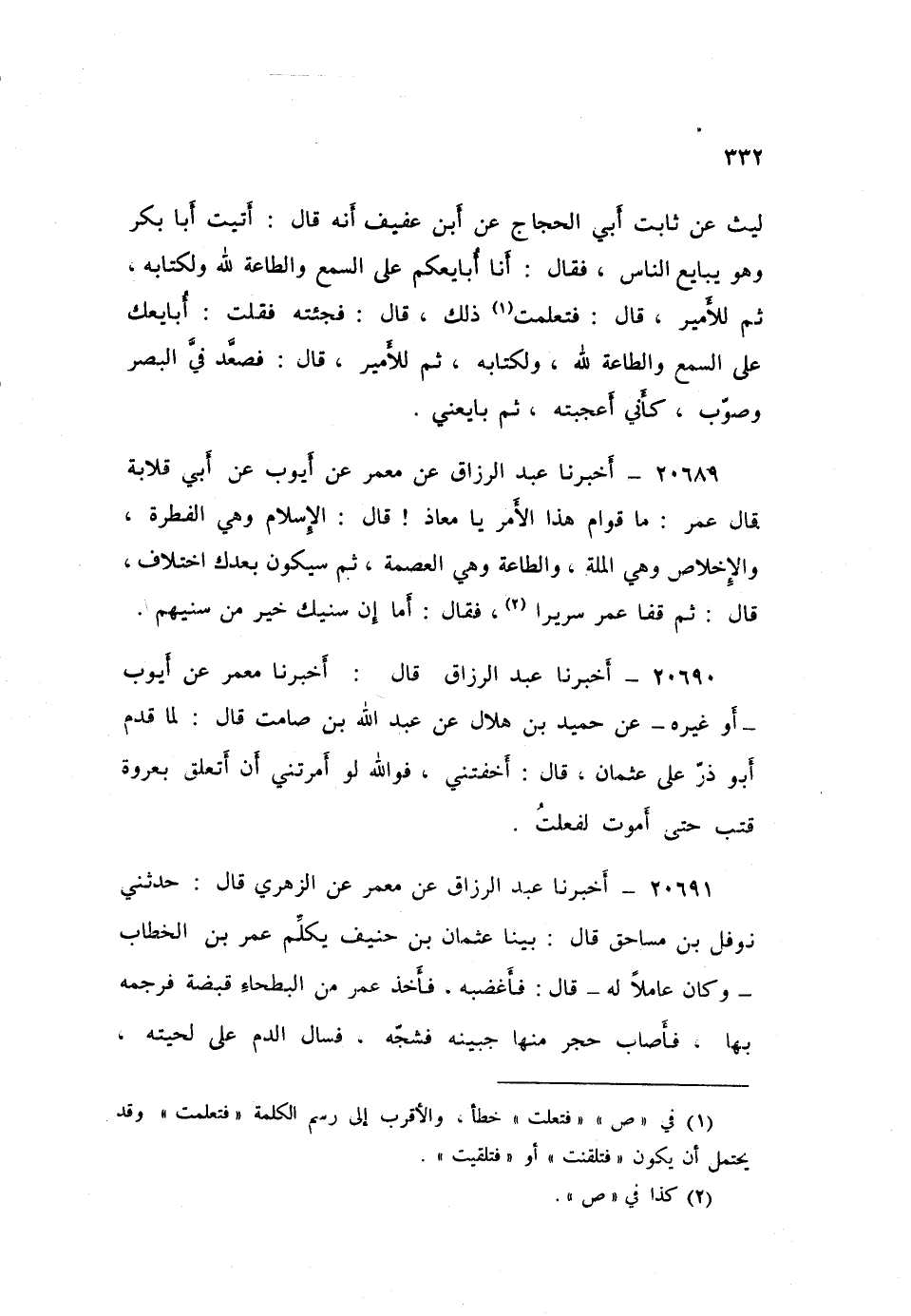 ٢٠٦٩١ - أَخْبَرَنَا عَبْدُ الرَّزَّاقِ، عَنْ مَعْمَرٍ، عَنِ الزُّهْرِيِّ، قَالَ: حَدَّثَنِي نَوْفَلُ بْنُ مُسَاحِقٍ، قَالَ: بَيْنَا عُثْمَانُ بْنُ حُنَيْفٍ يُكَلِّمُ عُمَرَ بْنَ الْخَطَّابِ - وَكَانَ عَامِلًا لَهُ - قَالَ: فَأَغْضَبَهُ فَأَخَذَ عُمَرُ مِنَ الْبَطْحَاءِ قَبْضَةً فَرَجَمَهُ بِهَا، فَأَصَابَ حَجَرٌ مِنْهَا جَبِينَهُ فَشَجَّهُ، فَسَالَ الدَّمُ عَلَى لِحْيَتِهِ، فَكَأَنَّهُ نَدِمَ، فَقَالَ: امْسَحِ الدَّمَ عَنْ لِحْيتِكَ، فَقَالَ: «لَا يَهْلِكُ هَذَا يَا أَمِيرَ الْمُؤْمِنِينَ، فَوَاللَّهِ لَمَا انْتَهَكْتُ مِمَّنْ وَلَّيْتَنِي أَمْرَهُ، أَشَدُّ مِمَّا انْتَهَكْتَ مِنِّي» ، قَالَ: فَكَأَنَّهُ أَعْجَبَ عُمَرَ ذَلِكَ مِنْهُ وَزَادَهُ عِنْدَهُ خَيْرًا