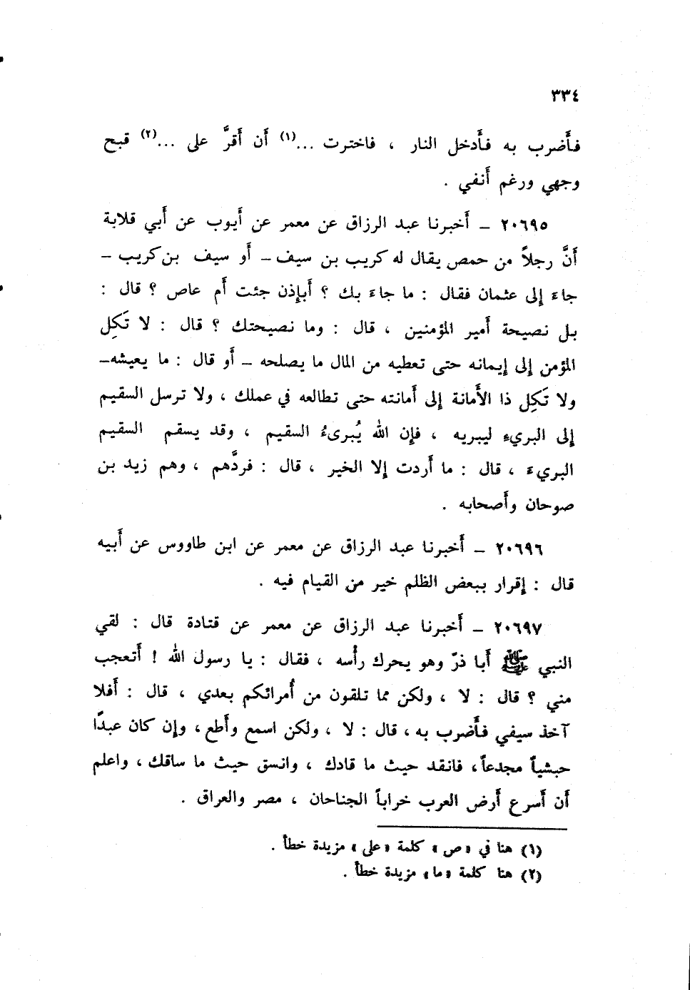 ٢٠٦٩٧ - أَخْبَرَنَا عَبْدُ الرَّزَّاقِ، قَالَ أَخْبَرَنَا مَعْمَرٌ، عَنْ قَتَادَةَ، قَالَ: لَقِيَ النَّبِيُّ صَلَّى اللهُ عَلَيْهِ وَسَلَّمَ أَبَا ذَرٍّ وَهُوَ يُحَرِّكُ رَأْسَهُ، فَقَالَ: يَا رَسُولَ اللَّهِ، أَتَعْجَبُ مِنِّي؟ قَالَ: «لَا، وَلَكِنْ مِمَّا تَلْقَوْنَ مِنْ أُمَرَائِكُمْ بَعْدِي» قَالَ: أَفَلَا آخُذُ سَيْفِي فَأَضْرِبُ بِهِ، قَالَ: «لَا، وَلَكِنِ اسْمَعْ وَأَطِعْ وَإِنْ كَانَ عَبْدًا حَبَشِيًّا مُجَدَّعًا، فَانْقَدْ حَيْثُ مَا قَادَكَ، وَانْسَقْ حَيْثُ مَا سَاقَكَ، وَاعْلَمْ أَنَّ أَسْرَعَ أَرْضِ الْعَرَبِ خَرَابًا الْجَنَاحَانِ: مِصْرُ وَالْعِرَاقُ»