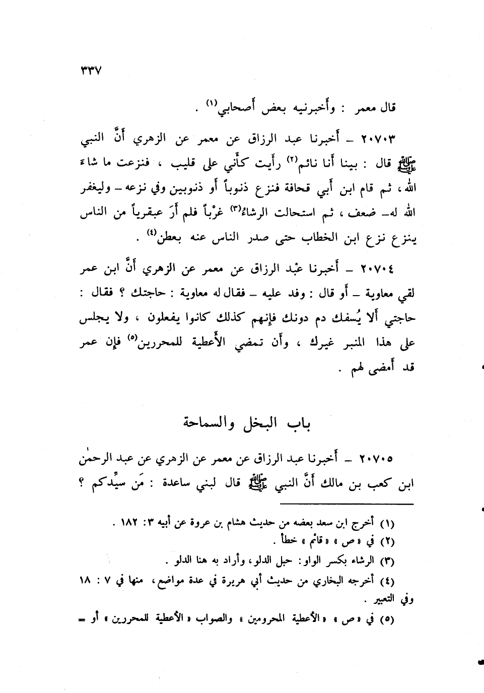 ٢٠٧٠٣ - أَخْبَرَنَا عَبْدُ الرَّزَّاقِ، عَنْ مَعْمَرٍ، عَنِ الزُّهْرِيِّ، أَنَّ النَّبِيَّ صَلَّى اللهُ عَلَيْهِ وَسَلَّمَ قَالَ: «بَيْنَا أَنَا نَائِمٌ رَأَيْتُ كَأَنِّي عَلَى قَلِيبٍ، فَنَزَعْتُ مَا شَاءَ اللَّهُ، ثُمَّ قَامَ ابْنُ أَبِي قُحَافَةَ فَنَزَعَ ذَنُوبًا، أَوْ ذَنُوبَيْنِ، وَفِي نَزْعِهِ - وَلْيَغْفِرِ اللَّهُ لَهُ - ضَعْفٌ، ثُمَّ اسْتَحَالَتِ الرِّشَاءُ غَرْبًا، فَلَمْ أَرَ عَبْقَرِيًّا مِنَ النَّاسِ يَنْزِعُ نَزْعَ ابْنِ الْخَطَّابِ حَتَّى صَدَرَ النَّاسُ عَنْهُ بِعَطَنٍ»