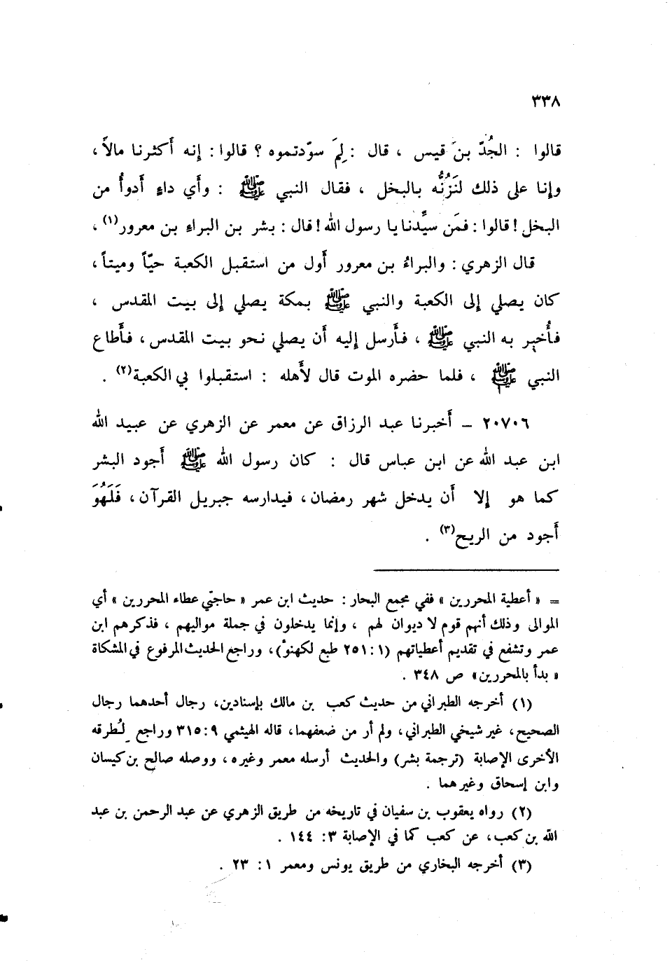 قَالَ الزُّهْرِيُّ: وَالْبَرَاءُ بْنُ مَعْرُورٍ أَوَّلُ مَنِ اسْتَقْبَلَ الْكَعْبَةَ حَيًّا وَمَيِّتًا، كَانَ يُصَلِّي إِلَى الْكَعْبَةِ وَالنَّبِيُّ صَلَّى اللهُ عَلَيْهِ وَسَلَّمَ بِمَكَّةَ يُصَلِّي إِلَى بَيْتِ الْمَقْدِسِ، فَأُخْبِرَ بِهِ النَّبِيُّ صَلَّى اللهُ عَلَيْهِ وَسَلَّمَ «فَأَرْسَلَ إِلَيْهِ أَنْ يُصَلِّيَ نَحْوَ بَيْتِ الْمَقْدِسِ» ، فَأَطَاعَ النَّبِيَّ صَلَّى اللهُ عَلَيْهِ وَسَلَّمَ، فَلَمَّا حَضَرَهُ الْمَوْتُ قَالَ لِأَهْلِهِ: «اسْتَقْبِلُوا بِيَ الْكَعْبَةَ»