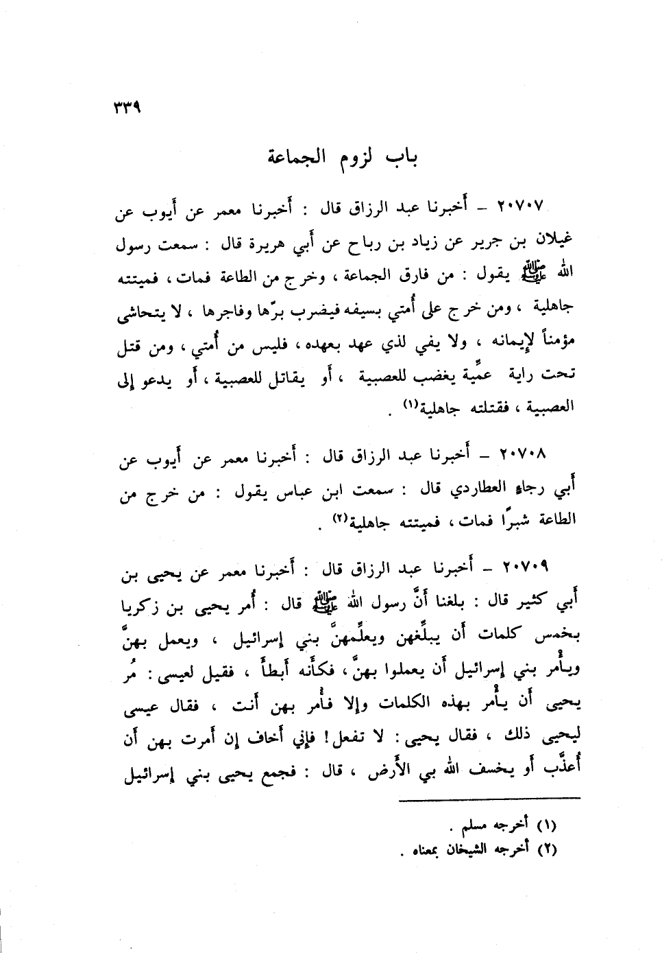 ٢٠٧٠٨ - أَخْبَرَنَا عَبْدُ الرَّزَّاقِ، قَالَ أَخْبَرَنَا مَعْمَرٌ، عَنْ أَيُّوبَ، عَنْ أَبِي رَجَاءٍ الْعُطَارِدِيِّ، قَالَ: سَمِعْتُ ابْنَ عَبَّاسٍ يَقُولُ: «مَنْ خَرَجَ مِنَ الطَّاعَةِ شِبْرًا فَمَاتَ فَمِيتَتُهُ جَاهِلِيَّةٌ»
