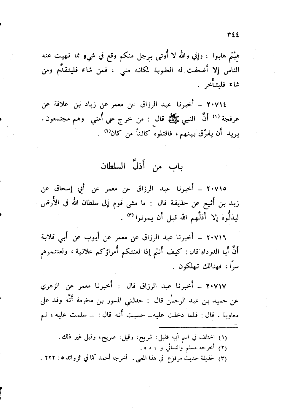 ٢٠٧١٤ - أَخْبَرَنَا عَبْدُ الرَّزَّاقِ، عَنْ مَعْمَرٍ، عَنْ زِيَادِ بْنِ عِلَاقَةَ، عَنْ عَرْفَجَةَ، أَنَّ النَّبِيَّ صَلَّى اللهُ عَلَيْهِ وَسَلَّمَ قَالَ: «مَنْ خَرَجَ عَلَى أُمَّتِي وَهُمْ مُجْتَمِعُونَ يُرِيدُ أَنْ يُفَرِّقَ بَيْنَهُمْ فَاقْتُلُوهُ كَائِنًا مَنْ كَانَ»
