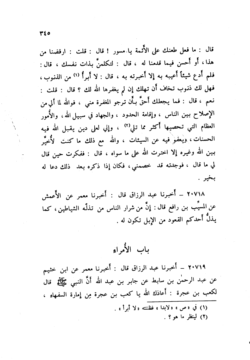 ٢٠٧١٩ - أَخْبَرَنَا عَبْدُ الرَّزَّاقِ، قَالَ أَخْبَرَنَا مَعْمَرٌ، عَنِ ابْنِ خُثَيْمٍ، عَنْ عَبْدِ الرَّحْمَنِ بْنِ سَابِطٍ، عَنْ جَابِرِ بْنِ عَبْدِ اللَّهِ: أَنَّ النَّبِيَّ صَلَّى اللهُ عَلَيْهِ وَسَلَّمَ قَالَ لِكَعْبِ بْنِ عُجْرَةَ: «أَعَاذَكَ اللَّهُ يَا كَعْبُ بْنَ عُجْرَةَ مِنْ إِمَارَةِ السُّفَهَاءِ» ، ⦗٣٤٦⦘ قَالَ: وَمَا إِمَارَةُ السُّفَهَاءِ؟ قَالَ: «أُمَرَاءُ يَكُونُونَ بَعْدِي، لَا يَهْدُونَ بِهَدْيِي، وَلَا يَسْتَنُّونَ بِسُنَّتِي، فَمَنْ صَدَّقَهُمْ بِكَذِبِهِمْ، وَأَعَانَهُمْ عَلَى ظُلْمِهِمْ، فَأُولَئِكَ لَيْسُوا مِنِّي وَلَسْتُ مِنْهُمْ، وَلَا يَرِدُونَ عَلَيَّ حَوْضِي، وَمَنْ لَمْ يُصَدِّقْهُمْ عَلَى كَذِبِهِمْ، وَلَمْ يُعِنْهُمْ عَلَى ظُلْمِهِمْ فَأُولَئِكَ مِنِّي، وَأَنَا مِنْهُمْ، وَسَيَرِدُونَ عَلَيَّ حَوْضِي، يَا كَعْبُ بْنَ عُجْرَةَ، الصَّوْمُ جُنَّةٌ، وَالصَّدَقَةُ تُطْفِئُ الْخَطِيئَةَ، وَالصَّلَاةُ قُرْبَانٌ - أَوْ قَالَ: بُرْهَانٌ - يَا كَعْبُ بْنَ عُجْرَةَ، إِنَّهُ لَا يَدْخُلُ الْجَنَّةَ لَحْمٌ نَبَتَ مِنْ سُحْتٍ أَبَدًا النَّارُ أَوْلَى بِهِ، يَا كَعْبُ بْنَ عُجْرَةَ، النَّاسُ غَادِيَانِ فَمُبْتَاعٌ نَفْسَهُ، فَمُعْتِقُهَا أَوْ بَائِعُهَا فَمُوبِقُهَا»