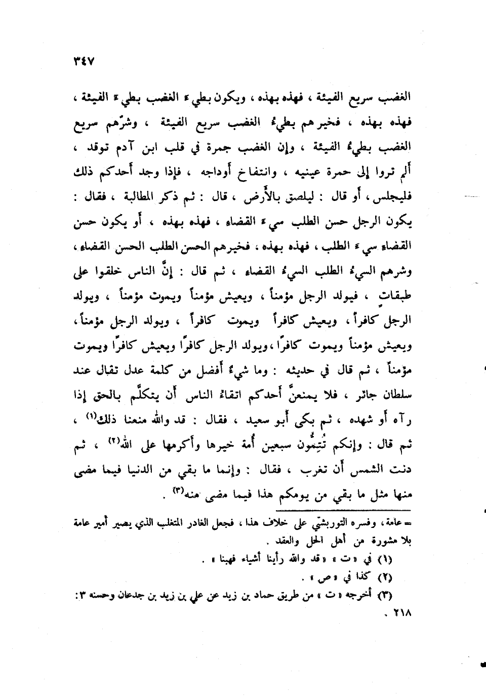 ثُمَّ قَالَ: «إِنَّ النَّاسَ خُلِقُوا عَلَى طَبَقَاتٍ، فَيُولَدُ الرَّجُلُ مُؤْمِنًا وَيَعِيشُ مُؤْمِنًا وَيَمُوتُ مُؤْمِنًا، وَيُولَدُ الرَّجُلُ كَافِرًا وَيَعِيشُ كَافِرًا وَيَمُوتُ كَافِرًا، وَيُولَدُ الرَّجُلُ مُؤْمِنًا وَيَعِيشُ مُؤْمِنًا وَيَمُوتُ كَافِرًا، وَيُولَدُ الرَّجُلُ كَافِرًا وَيَعِيشُ كَافِرًا وَيَمُوتُ مُؤْمِنًا»