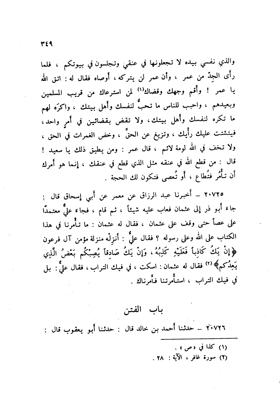 ٢٠٧٢٥ - أَخْبَرَنَا عَبْدُ الرَّزَّاقِ، قَالَ أَخْبَرَنَا مَعْمَرٌ، عَنْ أَبِي إِسْحَاقَ، قَالَ: جَاءَ أَبُو ذَرٍّ إِلَى عُثْمَانَ فَعَابَ عَلَيْهِ شَيْئًا، ثُمَّ قَامَ فَجَاءَ عَلِيٌّ مُعْتَمِدًا عَلَى عَصًا حَتَّى وَقَفَ عَلَى عُثْمَانَ، فَقَالَ لَهُ عُثْمَانُ: مَا تَأْمُرُنَا فِي هَذَا الْكِتَابِ عَلَى اللَّهِ وَعَلَى رَسُولِهِ؟ فَقَالَ عَلِيٌّ: «أَنْزِلْهُ مَنْزِلَةَ مُؤْمِنِ آلِ فِرْعَوْنَ {إِنْ يَكُ كَاذِبًا فَعَلَيْهِ كَذِبُهُ وَإِنْ يَكُ صَادِقًا يُصِبْكُمْ بَعْضُ الَّذِي يَعِدُكُمْ} [غافر: ٢٨] ، فَقَالَ لَهُ عُثْمَانُ: اسْكُتْ، فِي فِيكَ التُّرَابُ، فَقَالَ عَلِيٌّ:» بَلْ فِي فِيكَ التُّرَابُ، اسْتَأْمَرْتَنَا فَأَمَّرْنَاكَ "
