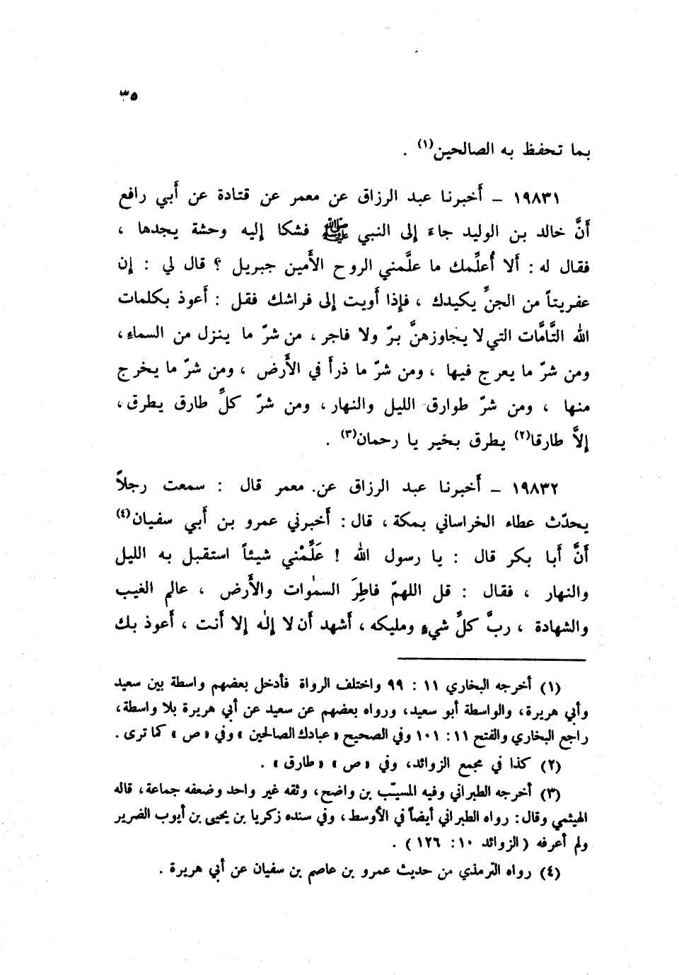 ١٩٨٣١ - أَخْبَرَنَا عَبْدُ الرَّزَّاقِ، عَنْ مَعْمَرٍ، عَنْ قَتَادَةَ، عَنْ أَبِي رَافِعٍ، أَنَّ خَالِدَ بْنَ الْوَلِيدِ، جَاءَ إِلَى النَّبِيِّ صَلَّى اللهُ عَلَيْهِ وَسَلَّمَ فَشَكَا إِلَيْهِ وَحْشَةً يجِدُهَا، فَقَالَ لَهُ: «أَلَا أُعَلِّمُكَ مَا عَلَّمَنِي الرُّوحُ الْأَمِينُ جِبْرِيلُ قَالَ لِي: إِنَّ عِفْرِيتًا مِنَ الْجِنِّ يَكِيدُكَ، فَإِذَا أَوَيْتَ إِلَى فِرَاشِكَ فَقُلْ: أَعُوذُ بِكَلِمَاتِ اللَّهِ التَّامَّاتِ الَّتِي لَا يُجَاوِزُهُنَّ بَرٌّ وَلَا فَاجِرٌ، مِنْ شَرِّ مَا يَنْزِلُ مِنَ السَّمَاءِ، وَمِنْ شَرِّ مَا يَعْرُجُ فِيهَا، وَمِنْ شَرِّ مَا ذَرَأَ فِي الْأَرْضِ، وَمِنْ شَرِّ مَا يَخْرُجُ مِنْهَا، وَمِنْ شَرِّ طَوَارِقِ اللَّيْلِ وَالنَّهَارِ، وَمِنْ شَرِّ كُلِّ طَارِقٍ يَطْرُقُ إِلَّا طَارِقًا يَطْرُقُ بِخَيْرٍ يَا رَحْمَانُ»