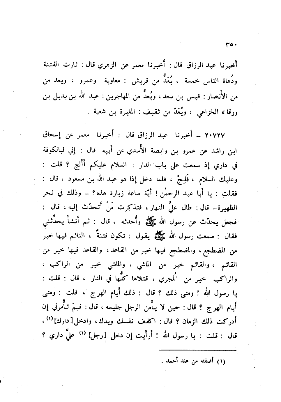 ٢٠٧٢٧ - أَخْبَرَنَا عَبْدُ الرَّزَّاقِ، قَالَ أَخْبَرَنَا مَعْمَرٌ، عَنْ إِسْحَاقَ بْنِ رَاشِدٍ، عَنْ عَمْرِو بْنِ وَابِصَةَ الْأَسَدِيِّ، عَنْ أَبِيهِ، قَالَ: إِنِّي لَبِالْكُوفَةِ فِي دَارِي إِذْ سَمِعْتُ عَلَى بَابِ الدَّارِ: السَّلَامُ عَلَيْكُمْ أَأَلِجُ؟ قُلْتُ: وَعَلَيْكَ السَّلَامُ فَلِجْ، فَلَمَّا دَخَلَ إِذَا هُوَ عَبْدُ اللَّهِ بْنُ مَسْعُودٍ، قَالَ: فَقُلْتُ: يَا أَبَا عَبْدِ الرَّحْمَنِ، أَيَّةُ سَاعَةِ زِيَارَةٍ هَذِهِ وَذَلِكَ فِي نَحْرِ الظَّهِيرَةِ، قَالَ: طَالَ عَلَيَّ النَّهَارُ فَتَذَكَّرْتُ مَنْ أَتَحَدَّثُ إِلَيْهِ، قَالَ: فَجَعَلَ يُحَدِّثُ عَنْ رَسُولِ اللَّهِ صَلَّى اللهُ عَلَيْهِ وَسَلَّمَ وَأُحَدِّثُهُ، قَالَ: ثُمَّ أَنْشَأَ يُحَدِّثُنِي فَقَالَ: سَمِعْتُ رَسُولَ اللَّهِ صَلَّى اللهُ عَلَيْهِ وَسَلَّمَ يَقُولُ: «تَكُونُ فِتْنَةٌ، النَّائِمُ فِيهَا خَيْرٌ مِنَ الْمُضْطَجِعِ، وَالْمُضْطَجِعُ فِيهَا خَيْرٌ مِنَ الْقَاعِدِ، وَالْقَاعِدُ فِيهَا خَيْرٌ مِنِ الْقَائِمِ، وَالْقَائِمُ خَيْرٌ مِنَ الْمَاشِي، وَالْمَاشِي خَيْرٌ مِنَ الرَّاكِبُ، وَالرَّاكِبُ خَيْرٌ مِنَ الْمُجْرِي، قَتْلَاهَا كُلُّهَا فِي النَّارِ» ، قَالَ: قُلْتُ: يَا رَسُولَ اللَّهِ، وَمَتَى ذَلِكَ؟ قَالَ: «ذَلِكَ أَيَّامَ الْهَرْجِ» ، قُلْتُ: وَمَتَى أَيَّامُ الْهَرْجِ؟ قَالَ: «حِينَ لَا يَأْمَنُ الرَّجُلُ جَلِيسَهُ» قَالَ: فَبِمَ تَأْمُرُنِي إِنْ أَدْرَكْتُ ذَلِكَ الزَّمَانَ؟ قَالَ: «اكْفُفْ نَفْسَكَ وَيَدَكَ وَادْخُلْ دَارَكَ» قَالَ: قُلْتُ: يَا رَسُولَ اللَّهِ، أَرَأَيْتَ إِنْ دَخَلَ رَجُلٌ عَلَيَّ دَارِي؟ ⦗٣٥١⦘ قَالَ: «فَادْخُلْ بَيْتَكَ» ، قَالَ: قُلْتُ: يَا رَسُولَ اللَّهِ، أَرَأَيْتَ إِنْ دَخَلَ عَلَيَّ بَيْتِي؟ قَالَ: «فَادْخُلْ مَسْجِدَكَ، وَاصْنَعْ هَكَذَا» وَقَبَضَ بِيَمِينِهِ عَلَى الْكُوعِ وَقُلْ: «رَبِّيَ اللَّهُ، حَتَّى تَمُوتَ عَلَى ذَلِكَ»