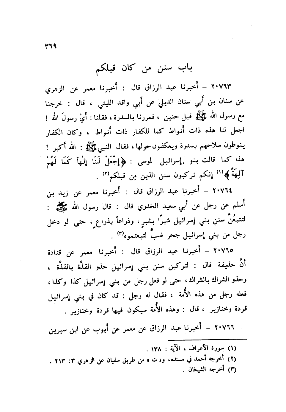 ٢٠٧٦٣ - أَخْبَرَنَا عَبْدُ الرَّزَّاقِ، قَالَ أَخْبَرَنَا مَعْمَرٌ، عَنِ الزُّهْرِيِّ، عَنْ سِنَانِ بْنِ أَبِي سِنَانٍ الدِّيلِيِّ، عَنْ أَبِي وَاقِدٍ اللَّيْثِيِّ، قَالَ: خَرَجْنَا مَعَ رَسُولِ اللَّهِ صَلَّى اللهُ عَلَيْهِ وَسَلَّمَ قَبْلَ حُنَيْنٍ فَمَرَرْنَا بِالسِّدْرَةِ، فَقُلْنَا: أَيْ رَسُولَ اللَّهِ، اجْعَلْ لَنَا هَذِهِ ذَاتَ أَنْوَاطٍ كَمَا لِلْكُفَّارِ ذَاتُ أَنْوَاطٍ، وَكَانَ الْكُفَّارُ يَنُوطُونَ سِلَاحَهُمْ بِسِدْرَةٍ، وَيَعْكُفُونَ حَوْلَهَا، فَقَالَ النَّبِيُّ صَلَّى اللهُ عَلَيْهِ وَسَلَّمَ: «اللَّهُ أَكْبَرُ، هَذَا كَمَا قَالَتْ بَنُو إِسْرَائِيلَ لِمُوسَى: {اجْعَلْ لَنَا إِلَهًا كَمَا لَهُمْ آلِهَةٌ} [الأعراف: ١٣٨] إِنَّكُمْ تَرْكَبُونَ سُنَنَ الَّذِينَ مِنْ قَبْلِكُمْ»