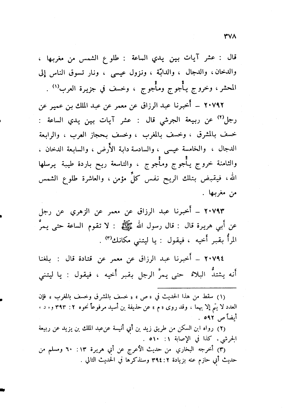 ٢٠٧٩٢ - أَخْبَرَنَا عَبْدُ الرَّزَّاقِ، عَنْ مَعْمَرٍ، عَنْ عَبْدِ الْمَلِكِ بْنِ عُمَيْرٍ، عَنْ رَجُلٍ، عَنْ رَبِيعَةَ الْجُرَشِيِّ، قَالَ: «عَشْرُ آيَاتٍ بَيْنَ يَدَيِ السَّاعَةِ: خَسْفٌ بِالْمَشْرِقِ، وَخَسْفٌ بِالْمَغْرِبِ، وَخَسْفٌ بِحِجَازِ الْعَرَبِ، وَالرَّابِعَةُ الدَّجَّالُ، وَالْخَامِسَةُ عِيسَى، وَالسَّادِسَةُ دَابَّةُ الْأَرْضِ، وَالسَّابِعَةُ الدُّخَانُ، وَالثَّامِنَةُ خُرُوجُ يَأْجُوجَ وَمَأْجُوجَ، وَالتَّاسِعَةُ رِيحٌ بَارِدَةٌ طَيِّبَةٌ يُرْسِلُهَا اللَّهُ فَيَقْبِضُ بِتِلْكَ الرِّيحِ نَفْسَ كُلِّ مُؤْمِنٍ، وَالْعَاشِرَةُ طُلُوعُ الشَّمْسِ مِنْ مَغْرِبِهَا»