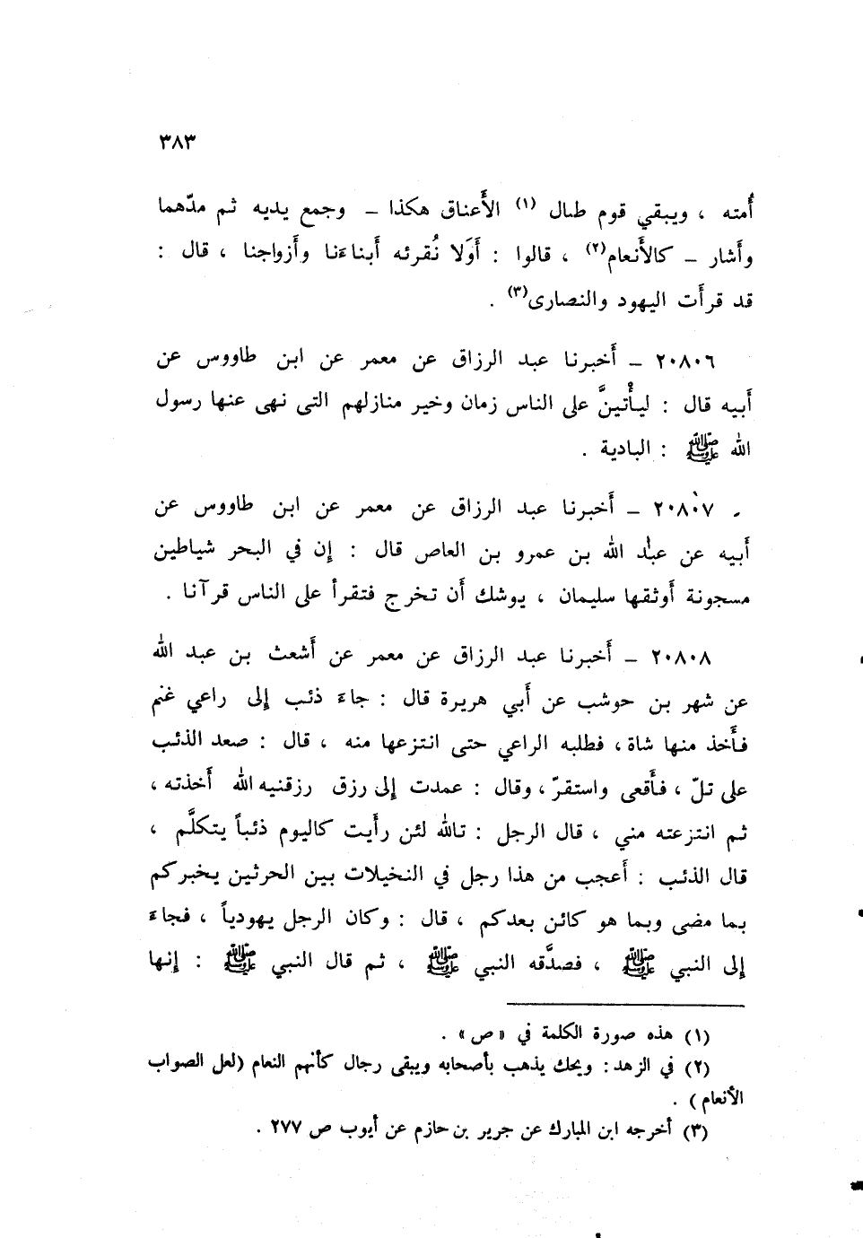 ٢٠٨٠٨ - أَخْبَرَنَا عَبْدُ الرَّزَّاقِ، عَنْ مَعْمَرٍ، عَنِ أَشْعَثَ بْنِ عَبْدِ اللَّهِ، عَنْ شَهْرِ بْنِ حَوْشَبٍ، عَنْ أَبِي هُرَيْرَةَ، قَالَ: جَاءَ ذِئْبٌ إِلَى رَاعِي غَنَمٍ فَأَخَذَ مِنْهَا شَاةً، فَطَلَبَهُ الرَّاعِي حَتَّى انْتَزَعَهَا مِنْهُ، قَالَ: صَعِدَ الذِّئْبُ عَلَى تَلٍّ فَأَقْعَى وَاسْتَقَرَّ، وَقَالَ: عَمَدْتَ إِلَى رِزْقٍ رَزَقَنِيهِ اللَّهُ أَخَذْتَهُ، ثُمَّ انْتَزَعْتَهُ مِنِّي؟ قَالَ الرَّجُلُ: تَاللَّهِ لَئِنْ رَأَيْتُ كَالْيَوْمِ ذِئْبًا يَتَكَلَّمُ، قَالَ الذِّئْبُ: أَعْجَبُ مِنْ هَذَا رَجُلٌ فِي النُّخَيْلَاتِ بَيْنَ الْحَرْثَيْنِ، يُخْبِرُكُمْ بِمَا مَضَى وَبِمَا هُوَ كَائِنٌ بَعْدَكُمْ، قَالَ: وَكَانَ الرَّجُلُ يَهُودِيًّا، فَجَاءَ إِلَى النَّبِيِّ صَلَّى اللهُ عَلَيْهِ وَسَلَّمَ، فَصَدَّقَهُ النَّبِيُّ صَلَّى اللهُ عَلَيْهِ وَسَلَّمَ، ثُمَّ قَالَ النَّبِيُّ صَلَّى اللهُ عَلَيْهِ وَسَلَّمَ: «إِنَّهَا ⦗٣٨٤⦘ أَمَارَةٌ مِنْ أَمَارَاتٍ بَيْنَ يَدَيِ السَّاعَةِ، قَدْ أَوْشَكَ الرَّجُلُ أَنْ يَخْرُجَ فَلَا يَرْجِعَ حَتَّى يُحَدِّثَهُ نَعْلَاهُ وَسَوْطُهُ بِمَا أَحْدَثَ أَهْلُهُ بَعْدَهُ»