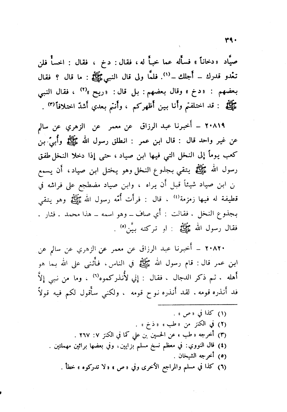 ٢٠٨١٩ - أَخْبَرَنَا عَبْدُ الرَّزَّاقِ، عَنْ مَعْمَرٍ، عَنِ الزُّهْرِيِّ، عَنْ سَالِمٍ، عَنْ غَيْرِ وَاحِدٍ، قَالَ: قَالَ ابْنُ عُمَرَ: انْطَلَقَ رَسُولُ اللَّهِ صَلَّى اللهُ عَلَيْهِ وَسَلَّمَ وَأُبَيُّ بْنُ كَعْبٍ يَوْمًا إِلَى النَّخْلِ الَّتِي فِيهَا ابْنُ صَيَّادٍ، حَتَّى إِذَا دَخَلَا النَّخْلَ طَفِقَ رَسُولُ اللَّهِ صَلَّى اللهُ عَلَيْهِ وَسَلَّمَ يَتَّقِي بِجُذُوعِ النَّخْلِ وَهُوَ يَخْتِلُ ابْنَ صَيَّادٍ، أَنْ يَسْمَعَ مِنِ ابْنِ صَيَّادٍ شَيْئًا قَبْلَ أَنْ يَرَاهُ، وَابْنُ صَيَّادٍ مُضْطَجِعٌ عَلَى فِرَاشِهِ فِي قَطِيفَةٍ لَهُ فِيهَا زَمْزَمَةٌ، قَالَ: فَرَأَتْ أُمُّهُ رَسُولَ اللَّهِ صَلَّى اللهُ عَلَيْهِ وَسَلَّمَ وَهُوَ يَتَّقِي بِجُذُوعِ النَّخْلِ فَقَالَتْ: أَيْ صَافِ - وَهُوَ اسْمُهُ - هَذَا مُحَمَّدٌ فَثَارَ، فَقَالَ رَسُولُ اللَّهِ صَلَّى اللهُ عَلَيْهِ وَسَلَّمَ: «لَوْ تَرَكْتِهِ بَيَّنَ»