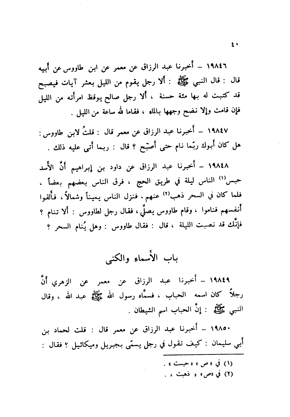 ١٩٨٤٧ - أَخْبَرَنَا عَبْدُ الرَّزَّاقِ، عَنْ مَعْمَرٍ، قَالَ: قُلْتُ لِابْنِ طَاوُسٍ: هَلْ كَانَ أَبُوكَ رُبَّمَا نَامَ حَتَّى أَصْبَحَ؟ قَالَ: «رُبَّمَا أَتَى عَلَيْهِ ذَلِكَ»