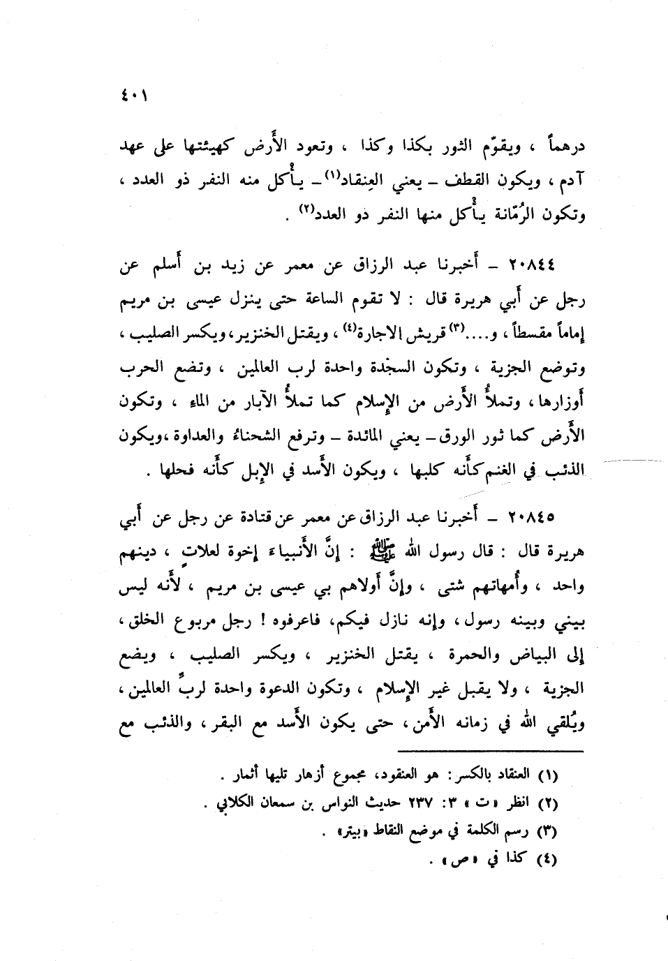 ٢٠٨٤٤ - أَخْبَرَنَا عَبْدُ الرَّزَّاقِ، عَنْ مَعْمَرٍ، عَنْ زَيْدِ بْنِ أَسْلَمَ، عَنْ رَجُلٍ، عَنْ أَبِي هُرَيْرَةَ، قَالَ: «لَا تَقُومُ السَّاعَةُ حَتَّى يَنْزِلَ عِيسَى ابْنُ مَرْيَمَ إِمَامًا مُقْسِطًا وَبيتر قُرَيْشٌ الْإِجَارَةَ، وَيَقْتُلُ الْخِنْزِيرَ، وَيَكْسِرُ الصَّلِيبَ، وَتُوضَعُ الْجِزْيَةُ، وَتَكُونُ السَّجْدَةُ وَاحِدَةً لِرَبِّ الْعَالَمِينَ، وَتَضَعُ الْحَرْبُ أَوْزَارَهَا، وَتُمْلَأُ الْأَرْضُ مِنَ الْإِسْلَامِ كَمَا تُمْلَأُ الْآبَارُ مِنَ الْمَاءِ، وَتَكُونُ الْأَرْضُ كَمَا ثَوْرُ الْوَرِقِ - يَعْنِي الْمَائِدَةَ -، وَتُرْفَعُ الشَّحْنَاءُ وَالْعَدَاوَةُ، وَيَكُونُ الذِّئْبُ فِي الْغَنَمِ كَأَنَّهُ كَلْبُهَا، وَيَكُونُ الْأَسَدُ فِي الْإِبِلِ كَأَنَّهُ فَحْلُهَا»