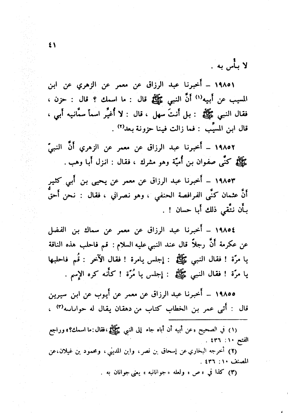١٩٨٥٢ - أَخْبَرَنَا عَبْدُ الرَّزَّاقِ، عَنْ مَعْمَرٍ، عَنِ الزُّهْرِيِّ، أَنَّ النَّبِيَّ صَلَّى اللهُ عَلَيْهِ وَسَلَّمَ كَنَّى صَفْوَانَ بْنَ أُمَيَّةَ وَهُوَ مُشْرِكٌ، فَقَالَ: «انْزِلْ أَبَا وَهْبٍ»