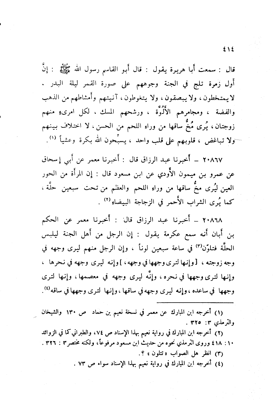 ٢٠٨٦٧ - أَخْبَرَنَا عَبْدُ الرَّزَّاقِ، قَالَ: أَخْبَرَنَا مَعْمَرٌ، عَنْ أَبِي إِسْحَاقَ، عَنْ عَمْرِو بْنِ مَيْمُونٍ الْأَوْدِيِّ، عَنِ ابْنِ مَسْعُودٍ، قَالَ: «إِنَّ الْمَرْأَةَ مِنَ الْحُورِ الْعِينِ لَيُرَى مُخُّ سَاقِهَا مِنْ وَرَاءِ اللَّحْمِ وَالْعَظْمِ مِنْ تَحْتِ سَبْعِينَ حُلَّةً، كَمَا يُرَى الشَّرَابُ الْأَحْمَرُ فِي الزُّجَاجَةِ الْبَيْضَاءِ»