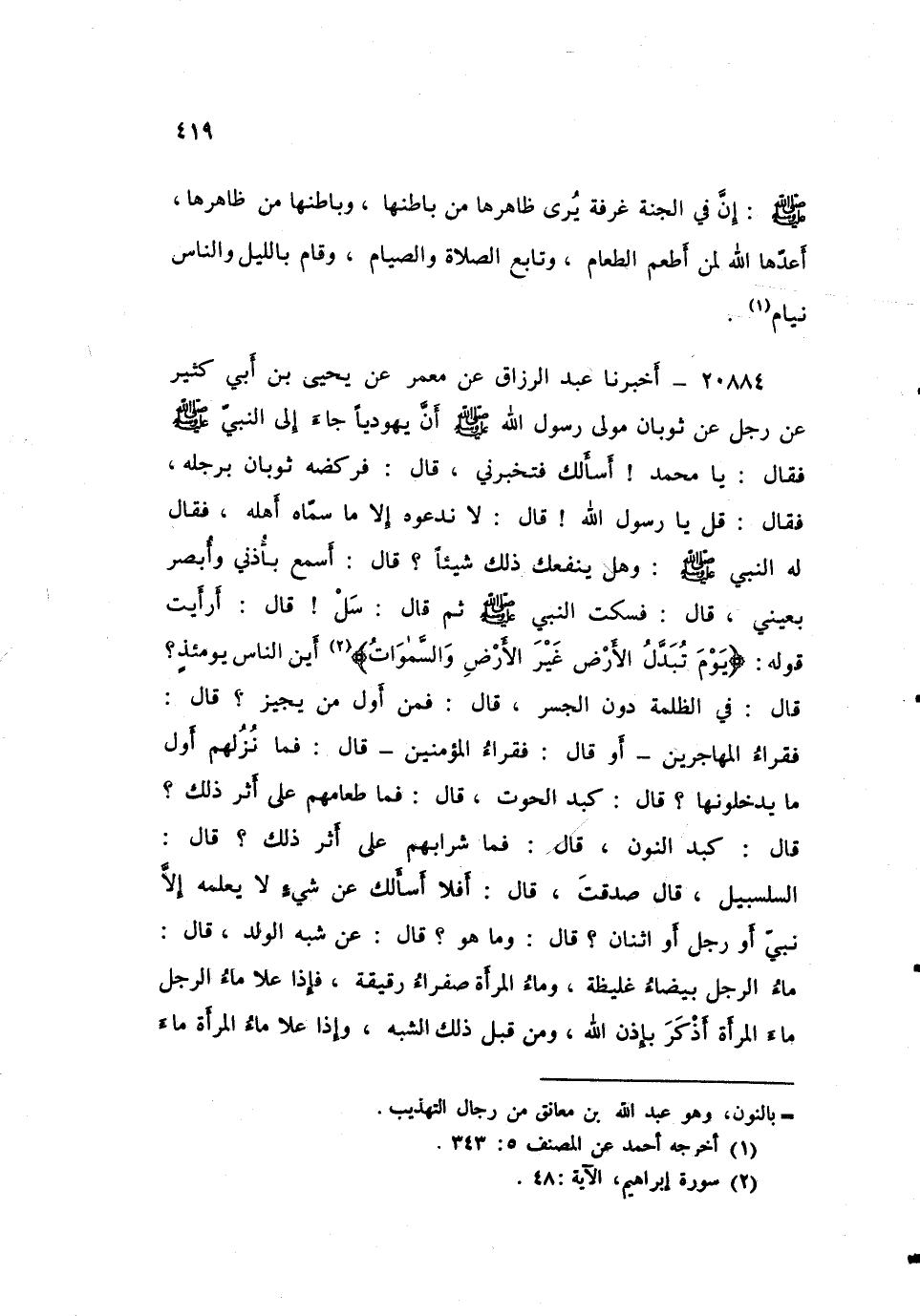 ٢٠٨٨٤ - أَخْبَرَنَا عَبْدُ الرَّزَّاقِ، عَنْ مَعْمَرٍ، عَنْ يَحْيَى بْنِ أَبِي كَثِيرٍ، عَنْ رَجُلٍ، عَنْ ثَوْبَانَ، مَوْلَى رَسُولِ اللَّهِ صَلَّى اللهُ عَلَيْهِ وَسَلَّمَ، أَنَّ يَهُودِيًّا جَاءَ إِلَى النَّبِيِّ صَلَّى اللهُ عَلَيْهِ وَسَلَّمَ فَقَالَ: يَا مُحَمَّدُ أَسْأَلُكَ فَتُخْبِرُنِي، قَالَ: فَرَكَضَهُ ثَوْبَانُ بِرِجْلِهِ، فَقَالَ: قُلْ: يَا رَسُولَ اللَّهِ، قَالَ: لَا نَدْعُوهُ إِلَّا مَا سَمَّاهُ أَهْلُهُ، فَقَالَ لَهُ النَّبِيُّ صَلَّى اللهُ عَلَيْهِ وَسَلَّمَ: «وَهَلْ يَنْفَعُكَ ذَلِكَ شَيْئًا؟» ، قَالَ: أَسْمَعُ بِأُذُنَيَّ، وَأُبْصِرُ بِعَيْنَيَّ، قَالَ: فَسَكَتَ النَّبِيُّ صَلَّى اللهُ عَلَيْهِ وَسَلَّمَ ثُمَّ قَالَ: «سَلْ» ، قَالَ: أَرَأَيْتَ قَوْلَهُ: {يَوْمَ تُبَدَّلُ الْأَرْضُ غَيْرَ الْأَرْضِ وَالسَّمَوَاتُ} أَيْنَ النَّاسُ يَوْمَئِذٍ؟ قَالَ: «فِي الظُّلْمَةِ دُونَ الْجِسْرِ» ، قَالَ: فَمَنْ أَوَّلُ مَنْ يُجِيزُ؟ قَالَ: «فُقَرَاءُ الْمُهَاجِرِينَ، أَوْ قَالَ: فُقَرَاءُ الْمُؤْمِنِينَ» ، قَالَ: فَمَا نُزُلُهُمْ أَوَّلَ مَا يَدْخُلُونَهَا؟ قَالَ: «كَبِدُ الْحُوتِ» ، قَالَ: فَمَا طَعَامُهُمْ عَلَى أَثَرِ ذَلِكَ؟ قَالَ: «كَبِدُ النُّونِ» ، قَالَ: فَمَا شَرَابُهُمْ عَلَى أَثَرِ ذَلِكَ؟ قَالَ: «السَّلْسَبِيلُ» ، قَالَ: صَدَقْتَ، قَالَ: أَفَلَا أَسْأَلُكَ عَنْ شَيْءٍ لَا يَعْلَمُهُ إِلَّا نَبِيُّ أَوْ رَجُلٌ أَوِ اثْنَانِ؟ قَالَ: «وَمَا هُوَ؟» ، قَالَ: عَنْ شَبَهِ الْوَلَدِ، قَالَ: «مَاءُ الرَّجُلِ بَيْضَاءُ غَلِيظَةٌ، وَمَاءُ الْمَرْأَةِ صَفْرَاءُ رَقِيقَةٌ، فَإِذَا عَلَا مَاءُ الرَّجُلِ مَاءَ الْمَرْأَةِ أَذْكَرَ بِإِذْنِ اللَّهِ، وَمِنْ قِبَلِ ذَلِكَ الشَّبَهُ، وَإِذَا عَلَا مَاءُ الْمَرْأَةِ مَاءَ ⦗٤٢٠⦘ الرَّجُلِ أَنْثَى بِإِذْنِ اللَّهِ، وَمِنْ قِبَلِ ذَلِكَ الشَّبَهُ» ، قَالَ: فَقَالَ النَّبِيُّ صَلَّى اللهُ عَلَيْهِ وَسَلَّمَ: «وَالَّذِي نَفْسِي بِيَدِهِ، مَا كَانَ عِنْدِي فِي شَيْءٍ مِمَّا سَأَلَنِي عَنْهُ عِلْمٌ حَتَّى أَنْبَأَنِيهِ اللَّهُ فِي مَجْلِسِي هَذَا»