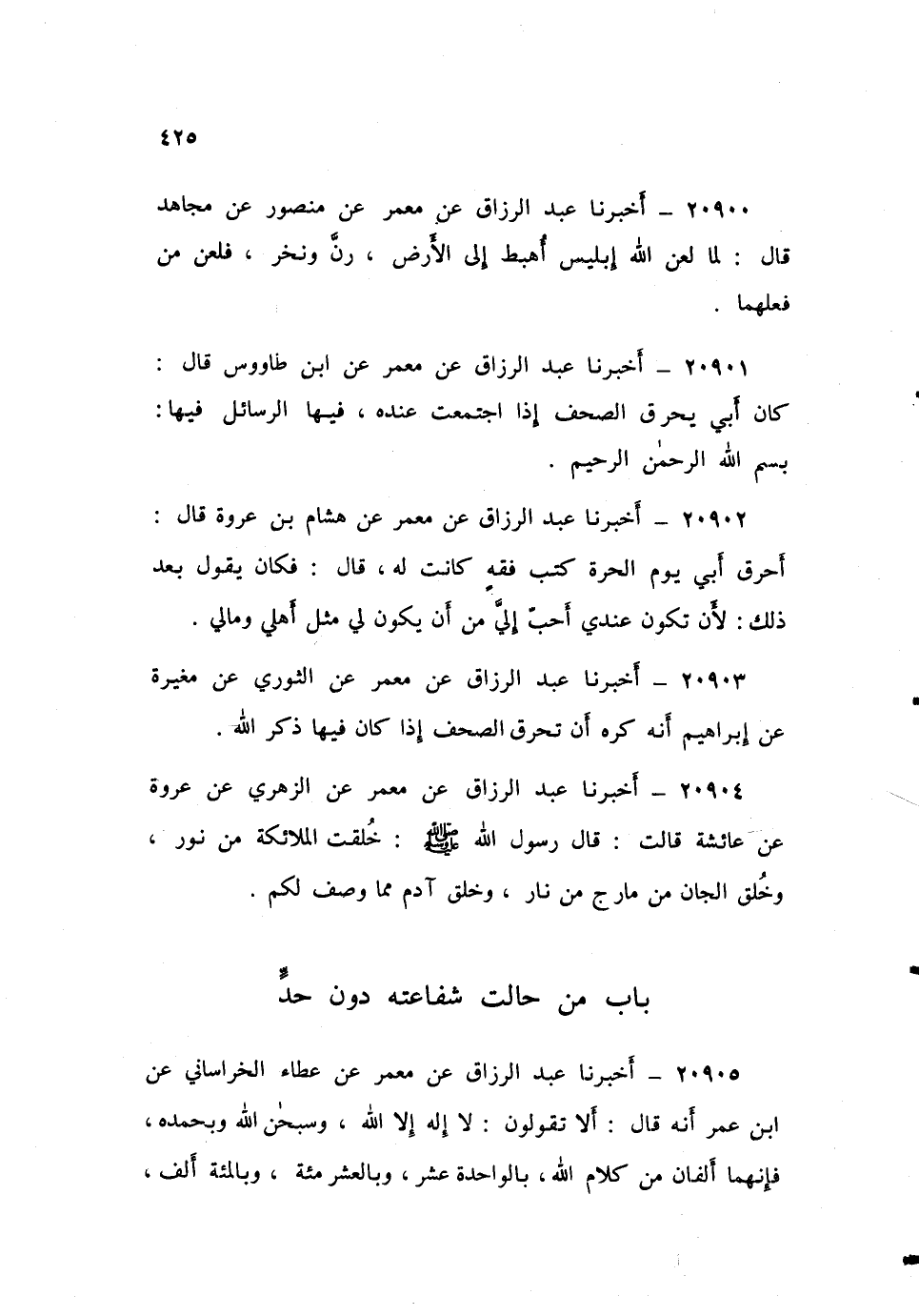٢٠٩٠٣ - أَخْبَرَنَا عَبْدُ الرَّزَّاقِ، عَنْ مَعْمَرٍ، عَنِ الثَّوْرِيِّ، عَنْ مُغِيرَةَ، عَنْ إِبْرَاهِيمَ «أَنَّهُ كَرِهَ أَنْ تُحَرَّقَ الصُّحُفُ إِذَا كَانَ فِيهَا ذِكْرُ اللَّهِ»