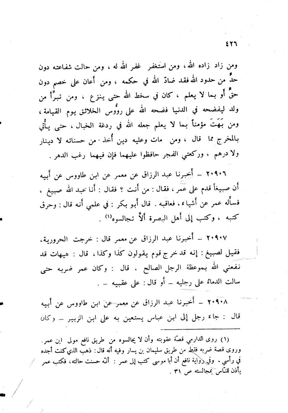 ٢٠٩٠٦ - أَخْبَرَنَا عَبْدُ الرَّزَّاقِ، عَنْ مَعْمَرٍ، عَنِ ابْنِ طَاوُسٍ، عَنْ أَبِيهِ، أَنَّ صَبِيغًا قَدِمَ عَلَى عُمَرَ فَقَالَ: «مَنْ أَنْتَ؟» ، فَقَالَ: أَنَا عَبْدُ اللَّهِ صَبِيغٌ، فَسَأَلَهُ عُمَرُ عَنْ أَشْيَاءَ، فَعَاقَبَهُ، قَالَ أَبُو بَكْرٍ: فِي عِلْمِي أَنَّهُ قَالَ: «وَحَرَّقَ كُتُبَهُ، وَكَتَبَ إِلَى أَهْلِ الْبَصْرَةِ: أَلَّا تُجَالِسُوهُ»