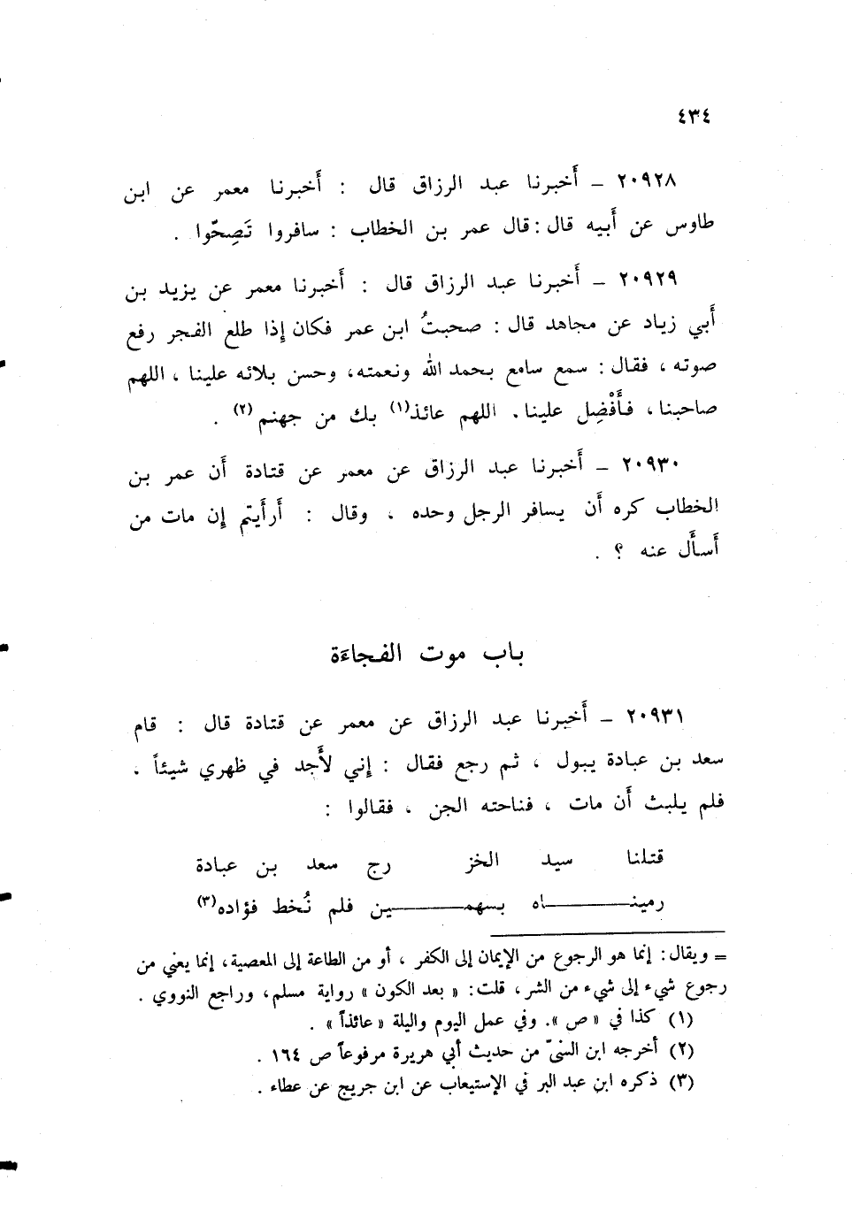 ٢٠٩٣١ - أَخْبَرَنَا عَبْدُ الرَّزَّاقِ، عَنْ مَعْمَرٍ، عَنْ قَتَادَةَ، قَالَ: «قَامَ سَعْدُ بْنُ عُبَادَةَ يَبُولُ ثُمَّ رَجَعَ، فَقَالَ: إِنِّي لَأَجِدُ فِي ظَهْرِي شَيْئًا» ، فَلَمْ يَلْبَثْ أَنْ مَاتَ، فَنَاحَتْهُ الْجِنُّ فَقَالُوا: