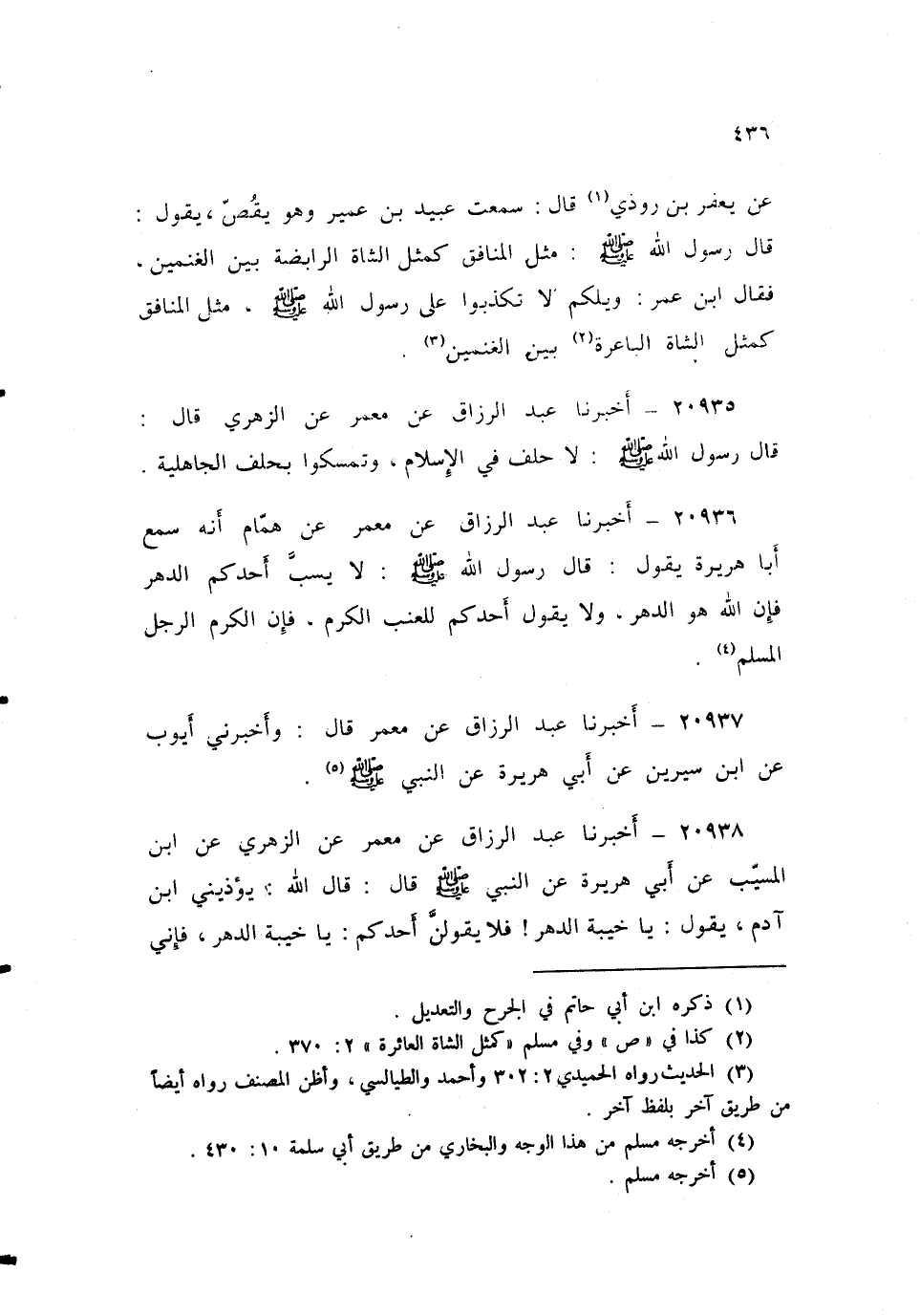 ٢٠٩٣٦ - أَخْبَرَنَا عَبْدُ الرَّزَّاقِ، عَنْ مَعْمَرٍ، عَنْ هَمَّامٍ، أَنَّهُ سَمِعَ أَبَا هُرَيْرَةَ يَقُولُ: قَالَ رَسُولُ اللَّهِ صَلَّى اللهُ عَلَيْهِ وَسَلَّمَ: «لَا يَسُبَّ أَحَدُكُمُ الدَّهْرَ، فَإِنَّ اللَّهَ هُوَ الدَّهْرُ، وَلَا يَقُلْ أَحَدُكُمْ لِلْعِنَبِ الْكَرْمَ، فَإِنَّ الْكَرْمَ الرَّجُلُ الْمُسْلِمُ»