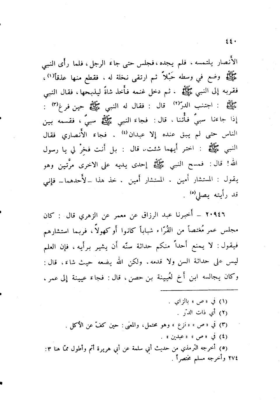 ٢٠٩٤٦ - أَخْبَرَنَا عَبْدُ الرَّزَّاقِ، عَنْ مَعْمَرٍ، عَنِ الزُّهْرِيِّ، قَالَ: كَانَ مَجْلِسُ عُمَرَ مُغْتَصًّا مِنَ الْقُرَّاءِ شَبَابًا كَانُوا أَوْ كُهُولًا، فَرُبَّمَا اسْتَشَارَهُمْ فَيَقُولُ: «لَا يَمْنَعُ أَحَدًا مِنْكُمْ حَدَاثَةُ سِنِّهِ أَنْ يُشِيرَ بِرَأْيِهِ، فَإِنَّ الْعِلْمَ لَيْسَ عَلَى حَدَاثَةِ السِّنِّ وَلَا قِدَمِهِ، وَلَكِنَّ اللَّهَ يَضَعُهُ حَيْثُ شَاءَ» ، قَالَ: وَكَانَ يُجَالِسُهُ ابْنُ أَخٍ لِعُيَيْنَةَ بْنِ حِصْنٍ قَالَ: فَجَاءَ عُيَيْنَةُ إِلَى عُمَرَ فَقَالَ: وَاللَّهِ مَا تَقُولُ الْعَدْلَ، وَلَا تُعْطِي الْجَزْلَ، قَالَ: فَهَمَّ عُمَرُ بِهِ، فَقَالَ ابْنُ أَخِيهِ: يَا أَمِيرَ الْمُؤْمِنِينَ، إِنَّ اللَّهَ يَقُولُ: {خُذِ الْعَفْوَ وَأْمُرْ بِالْعُرْفِ وَأَعْرِضْ عَنِ الْجَاهِلِينَ} [الأعراف: ١٩٩] ، وَإِنَّ هَذَا مِنَ الْجَاهِلِينَ، قَالَ: فَتَرَكَهُ عُمَرُ، فَلَمَّا وُلِّيَ عُثْمَانُ جَاءَهُ عُيَيْنَةُ فَقَالَ: إِنَّ عُمَرَ أَعْطَانَا فَأَغْنَانَا فَاتَّقَانَا
