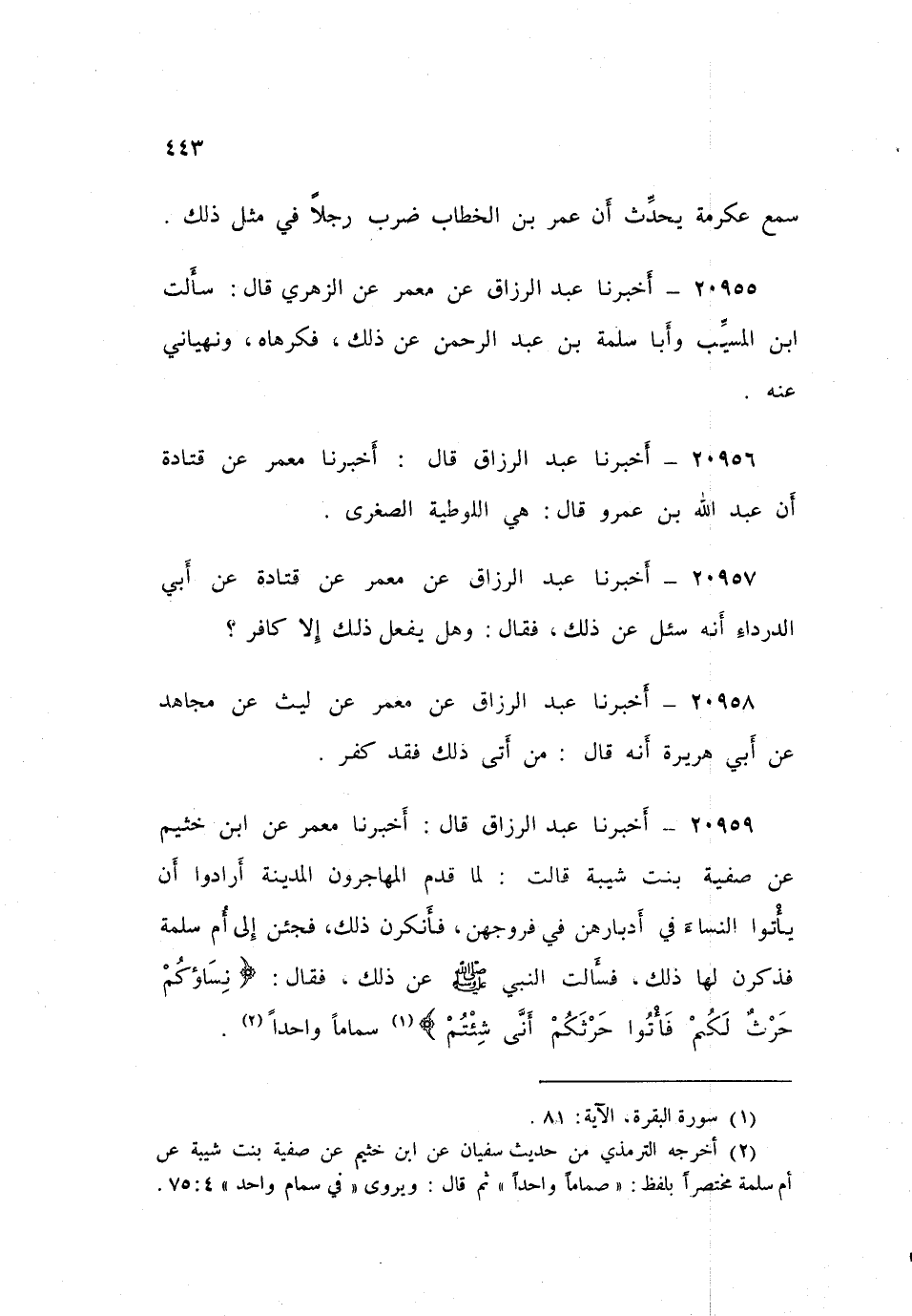 ٢٠٩٥٩ - أَخْبَرَنَا عَبْدُ الرَّزَّاقِ، قَالَ أَخْبَرَنَا مَعْمَرٌ، عَنِ ابْنِ خُثَيْمٍ، عَنْ صَفِيَّةَ بِنْتِ شَيْبَةَ قَالَتْ: لَمَّا قَدِمَ الْمُهَاجِرُونَ الْمَدِينَةَ أَرَادُوا أَنْ يَأْتُوا النِّسَاءَ فِي أَدْبَارِهِنَّ فِي فُرُوجِهِنَّ، فَأَنْكَرْنَ ذَلِكَ، فَجِئْنَ إِلَى أُمِّ سَلَمَةَ فَذَكَرْنَ لَهَا ذَلِكَ، فَسَأَلَتِ النَّبِيَّ صَلَّى اللهُ عَلَيْهِ وَسَلَّمَ عَنْ ذَلِكَ فَقَالَ: {نِسَاؤُكُمْ حَرْثٌ لَكُمْ فَأْتُوا حَرْثَكُمْ أَنَّى شِئْتُمْ} [البقرة: ٢٢٣] «سِمَامًا وَاحِدًا»
