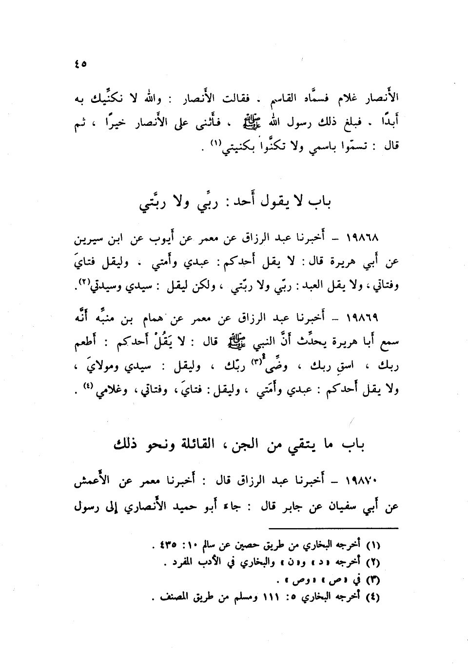 ١٩٨٦٩ - أَخْبَرَنَا عَبْدُ الرَّزَّاقِ، عَنْ مَعْمَرٍ، عَنْ هَمَّامِ بْنِ مُنَبِّهٍ، أَنَّهُ سَمِعَ أَبَا هُرَيْرَةَ، يُحَدِّثُ، أَنَّ النَّبِيَّ صَلَّى اللهُ عَلَيْهِ وَسَلَّمَ قَالَ: «لَا يَقُلْ أَحَدُكُمْ: أَطْعِمْ رَبَّكَ، اسْقِ رَبَّكَ، وَضِّئْ رَبَّكَ، وَلْيَقُلْ: سَيِّدِي وَمَوْلَايَ، وَلَا يَقُلْ أَحَدُكُمْ: عَبْدِي وَأَمَتِي، وَلْيَقُلْ: فَتَايَ وَفَتَاتِي، وَغُلَامِي»