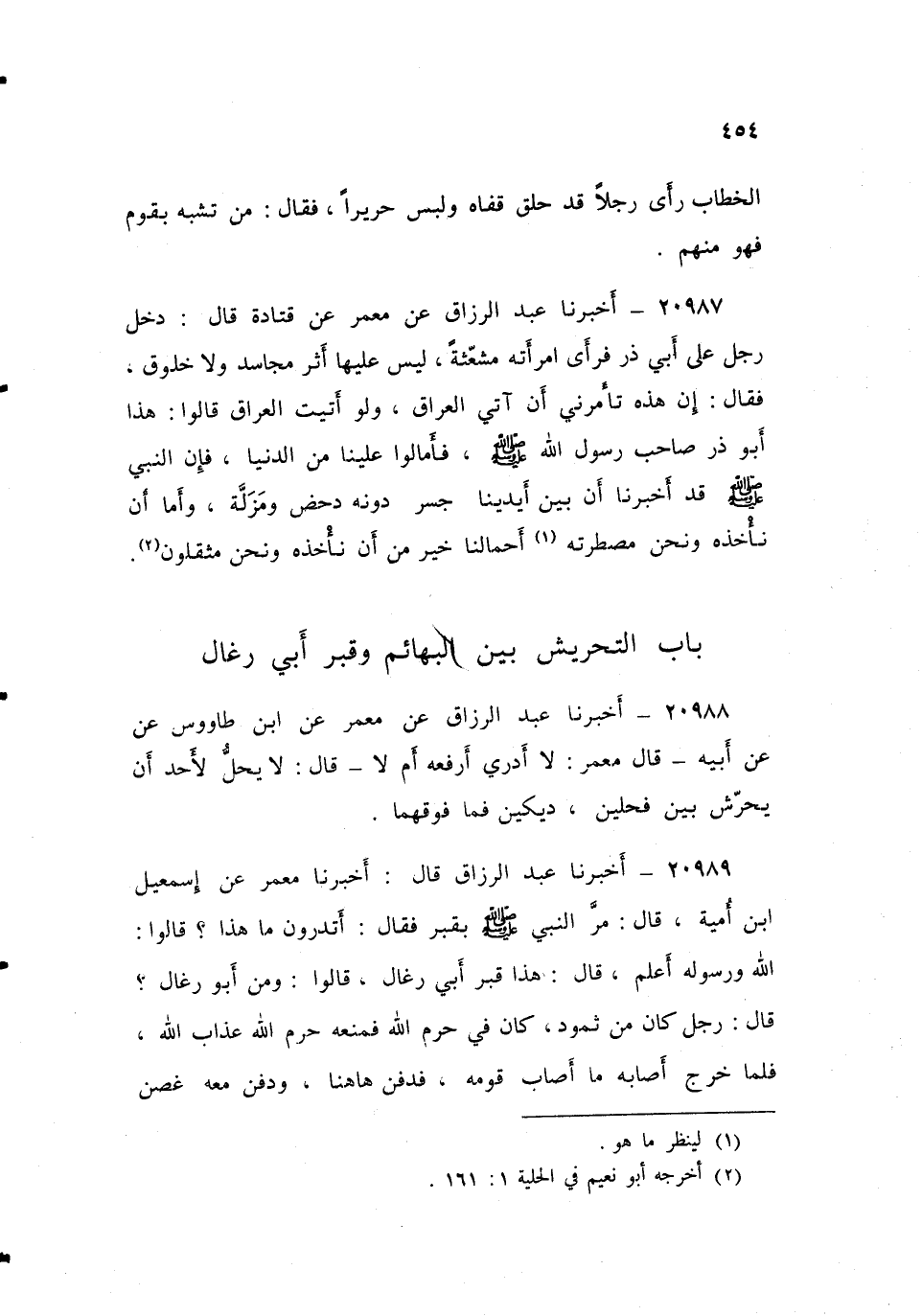٢٠٩٨٩ - أَخْبَرَنَا عَبْدُ الرَّزَّاقِ، قَالَ أَخْبَرَنَا مَعْمَرٌ، عَنِ إِسْمَاعِيلَ بْنِ أُمَيَّةَ، قَالَ: مَرَّ النَّبِيُّ صَلَّى اللهُ عَلَيْهِ وَسَلَّمَ بِقَبْرٍ، فَقَالَ: «أَتَدْرُونَ مَا هَذَا؟» ، قَالُوا: اللَّهُ وَرَسُولُهُ أَعْلَمُ، قَالَ: «هَذَا قَبْرُ أَبِي رِغَالٍ» ، قَالُوا: وَمَنْ أَبُو رِغَالٍ؟ قَالَ: «رَجُلٌ كَانَ مِنْ ثَمُودَ، كَانَ فِي حَرَمِ اللَّهِ، فَمَنَعَهُ حَرَمُ اللَّهِ عَذَابَ اللَّهِ، فَلَمَّا خَرَجَ أَصَابَهُ مَا أَصَابَ قَوْمَهُ، فَدُفِنَ هَاهُنَا، وَدُفِنَ مَعَهُ غُصْنٌ مِنْ ذَهَبٍ فَابْتَدَرَهُ الْقَوْمُ، فَبَحَثُوا عَنْهُ حَتَّى اسْتَخْرَجُوا الْغُصْنَ»