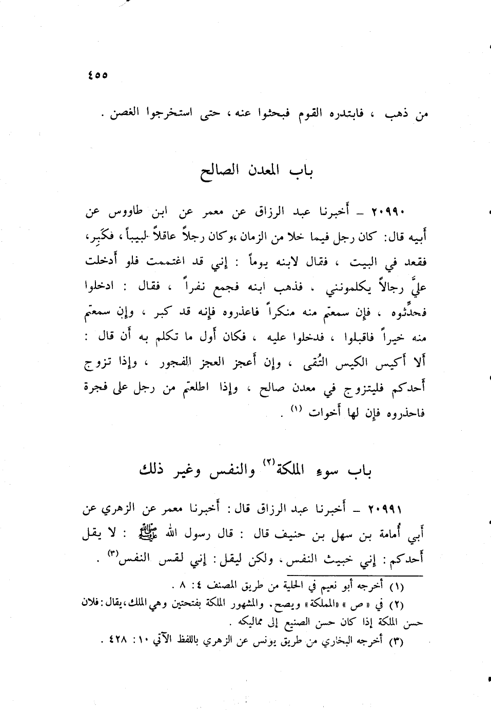 ٢٠٩٩١ - أَخْبَرَنَا عَبْدُ الرَّزَّاقِ، قَالَ أَخْبَرَنَا مَعْمَرٌ، عَنِ الزُّهْرِيِّ، عَنْ أَبِي أُمَامَةَ بْنِ سَهْلِ بْنِ حُنَيْفٍ، قَالَ: قَالَ رَسُولُ اللَّهِ صَلَّى اللهُ عَلَيْهِ وَسَلَّمَ: «لَا يَقُلْ أَحَدُكُمْ إِنِّي خَبِيثُ النَّفْسِ، وَلَكِنْ لِيَقُلْ: إِنِّي لَقِسُ النَّفْسِ»