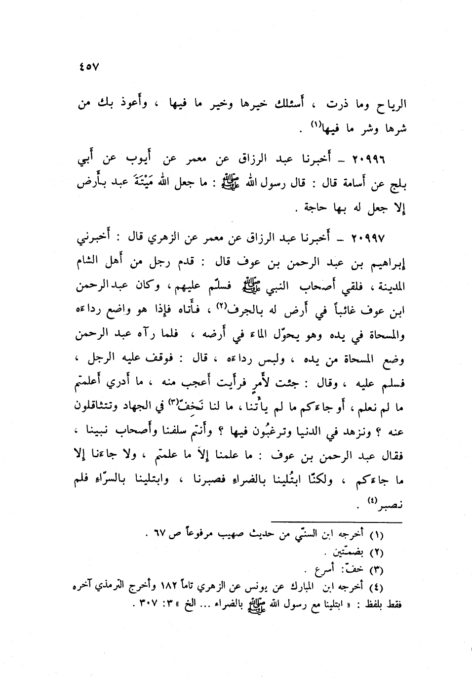 ٢٠٩٩٧ - أَخْبَرَنَا عَبْدُ الرَّزَّاقِ، عَنْ مَعْمَرٍ، عَنِ الزُّهْرِيِّ، قَالَ: أَخْبَرَنِي إِبْرَاهِيمُ بْنُ عَبْدِ الرَّحْمَنِ بْنِ عَوْفٍ، قَالَ: قَدِمَ رَجُلٌ مِنْ أَهْلِ الشَّامِ الْمَدِينَةَ، فَلَقِيَ أَصْحَابَ النَّبِيِّ صَلَّى اللهُ عَلَيْهِ وَسَلَّمَ فَسَلَّمَ عَلَيْهِمْ، وَكَانَ عَبْدُ الرَّحْمَنِ بْنُ عَوْفٍ غَائِبًا فِي أَرْضٍ لَهُ بِالْجُرُفِ، فَأَتَاهُ، فَإِذَا هُوَ وَاضِعٌ رِدَاءَهُ، وَالْمِسْحَاةُ فِي يَدِهِ وَهُوَ يُحَوِّلُ الْمَاءَ فِي أَرْضِهِ، فَلَمَّا رَآهُ عَبْدُ الرَّحْمَنِ وَضَعَ الْمِسْحَاةَ مِنْ يَدِهِ، وَلَبِسَ رِدَاءَهُ، قَالَ: فَوَقَفَ عَلَيْهِ الرجل فسلم عليه وَقَالَ: جِئْتُ لِأَمْرٍ، فَرَأَيْتُ أَعْجَبَ مِنْهُ، مَا أَدْرِي أَعَلِمْتُمْ مَا لَمْ نَعْلَمْ، أَوْ جَاءَكُمْ مَا لَمْ يَأْتِنَا، مَا لَنَا نَخِفُّ فِي الْجِهَادِ وَتَتَثَاقَلُونَ عَنْهُ، وَنَزْهَدُ فِي الدُّنْيَا وَتَرْغَبُونَ فِيهَا، وَأَنْتُمْ سَلَفُنَا وَأَصْحَابُ نَبِيِّنَا؟ فَقَالَ عَبْدُ الرَّحْمَنِ بْنُ عَوْفٍ: «مَا عَلِمْنَا إِلَّا مَا عَلِمْتُمْ، وَلَا جَاءَنَا إِلَّا مَا جَاءَكُمْ، وَلَكِنَّا ابْتُلِينَا بِالضَّرَّاءِ فَصَبَرْنَا، وَابْتُلِينَا بِالسَّرَّاءِ فَلَمْ نَصْبِرْ»