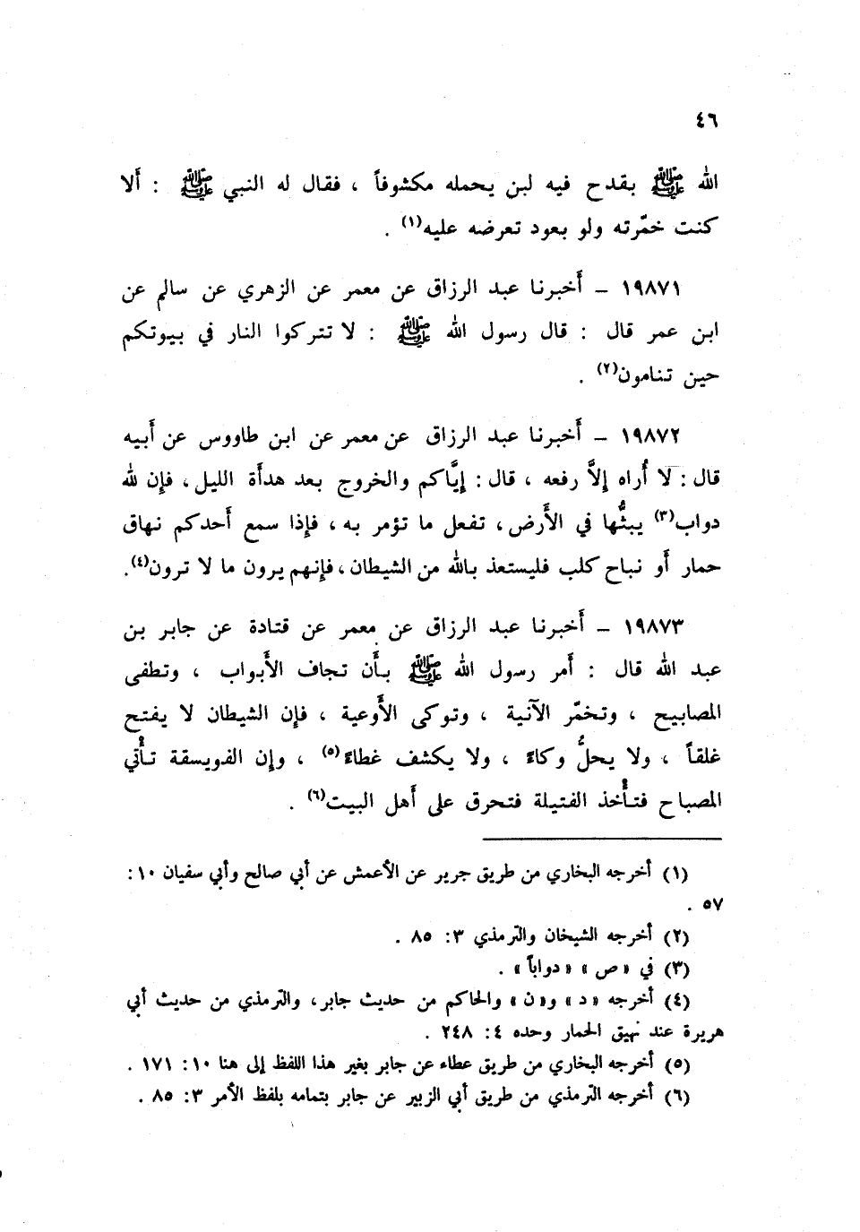 ١٩٨٧١ - أَخْبَرَنَا عَبْدُ الرَّزَّاقِ، عَنْ مَعْمَرٍ، عَنِ الزُّهْرِيِّ، عَنْ سَالِمٍ، عَنِ ابْنِ عُمَرَ، قَالَ: قَالَ رَسُولُ اللَّهِ صَلَّى اللهُ عَلَيْهِ وَسَلَّمَ: «لَا تَتْرُكُوا النَّارَ فِي بُيُوتِكُمْ حِينَ تَنَامُونَ»