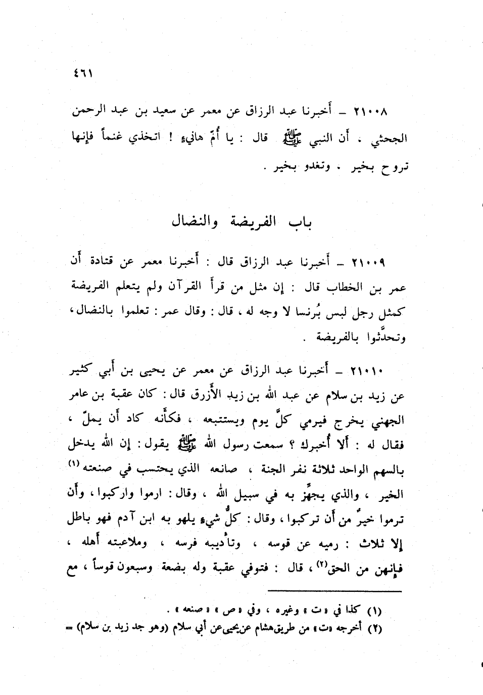٢١٠٠٩ - أَخْبَرَنَا عَبْدُ الرَّزَّاقِ، قَالَ أَخْبَرَنَا مَعْمَرٌ، عَنْ قَتَادَةَ، أَنَّ عُمَرَ بْنَ الْخَطَّابِ، قَالَ: «إِنَّ مَثَلَ مَنْ قَرَأَ الْقُرْآنَ وَلَمْ يَتَعَلَّمِ الْفَرِيضَةَ، كَمَثَلِ رَجُلٍ لَبِسَ بُرْنُسًا لَا وَجْهَ لَهُ» ، قَالَ: وَقَالَ عُمَرُ: «تَعَلَّمُوا بِالنِّضَالِ، وَتَحَدَّثُوا بِالْفَرِيضَةِ»