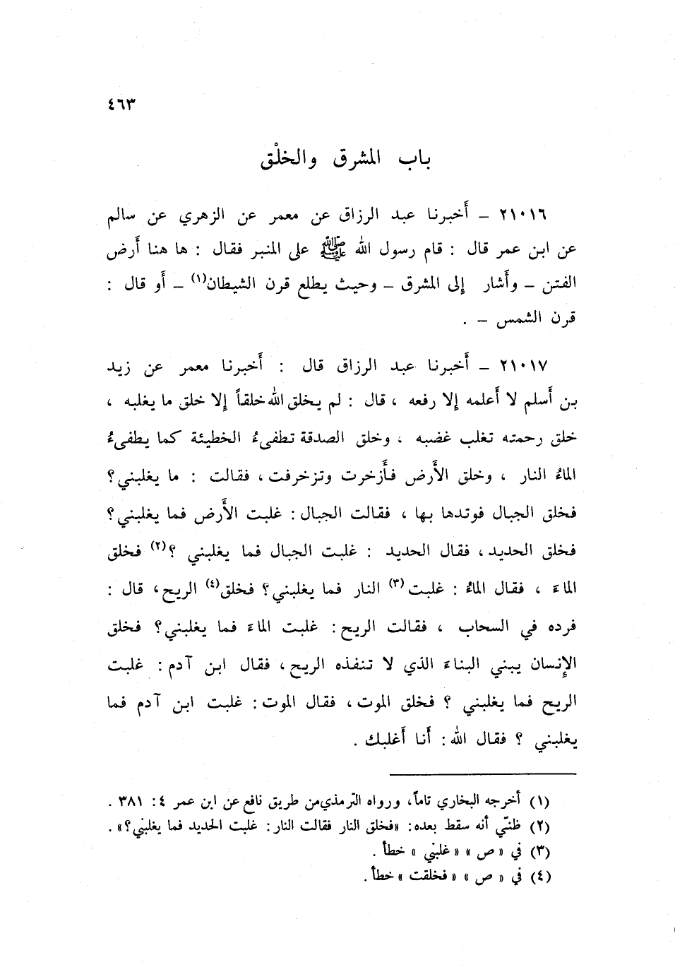 ٢١٠١٧ - أَخْبَرَنَا عَبْدُ الرَّزَّاقِ، قَالَ أَخْبَرَنَا مَعْمَرٌ، عَنْ زَيْدِ بْنِ أَسْلَمَ، لَا أَعْلَمُهُ إِلَّا رَفَعَهُ قَالَ: «لَمْ يَخْلُقِ اللَّهُ خَلْقًا إِلَّا خَلَقَ مَا يَغْلِبُهُ، خَلَقَ رَحْمَتَهُ تَغْلِبُ غَضَبَهُ، وَخَلَقَ الصَّدَقَةَ تُطْفِئُ الْخَطِيئَةَ كَمَا يُطْفِئُ الْمَاءُ النَّارَ، وَخَلَقَ الْأَرْضَ فَأَزْخَرَتْ وَتَزَخْرَفَتْ، فَقَالَتْ: مَا يَغْلِبُنِي؟ فَخَلَقَ الْجِبَالَ فَوَتَدَهَا بِهَا، فَقَالَتِ الْجِبَالُ: غَلَبْتُ الْأَرْضَ فَمَا يَغْلِبُنِي؟ فَخَلَقَ الْحَدِيدَ، فَقَالَ الْحَدِيدُ: غَلَبْتُ الْجِبَالَ فَمَا يَغْلِبُنِي؟ فَخَلَقَ الْمَاءَ، فَقَالَ الْمَاءُ: غَلَبْتُ النَّارَ فَمَا يَغْلِبُنِي؟ فَخَلَقَ الرِّيحَ، قَالَ: فَرَدَّهُ فِي السَّحَابِ، فَقَالَتِ الرِّيحُ: غَلَبْتُ الْمَاءَ فَمَا يَغْلِبُنِي؟ فَخَلَقَ الْإِنْسَانَ يَبْنِي الْبِنَاءَ الَّذِي لَا تَنْفُذُهُ الرِّيحُ، فَقَالَ ابْنُ آدَمَ: غَلَبْتُ الرِّيحَ فَمَا يَغْلِبُنِي؟ فَخَلَقَ الْمَوْتَ، فَقَالَ الْمَوْتُ: غَلَبْتُ ابْنَ آدَمَ فَمَا يَغْلِبُنِي؟ فَقَالَ اللَّهُ: أَنَا أَغْلِبُكَ»