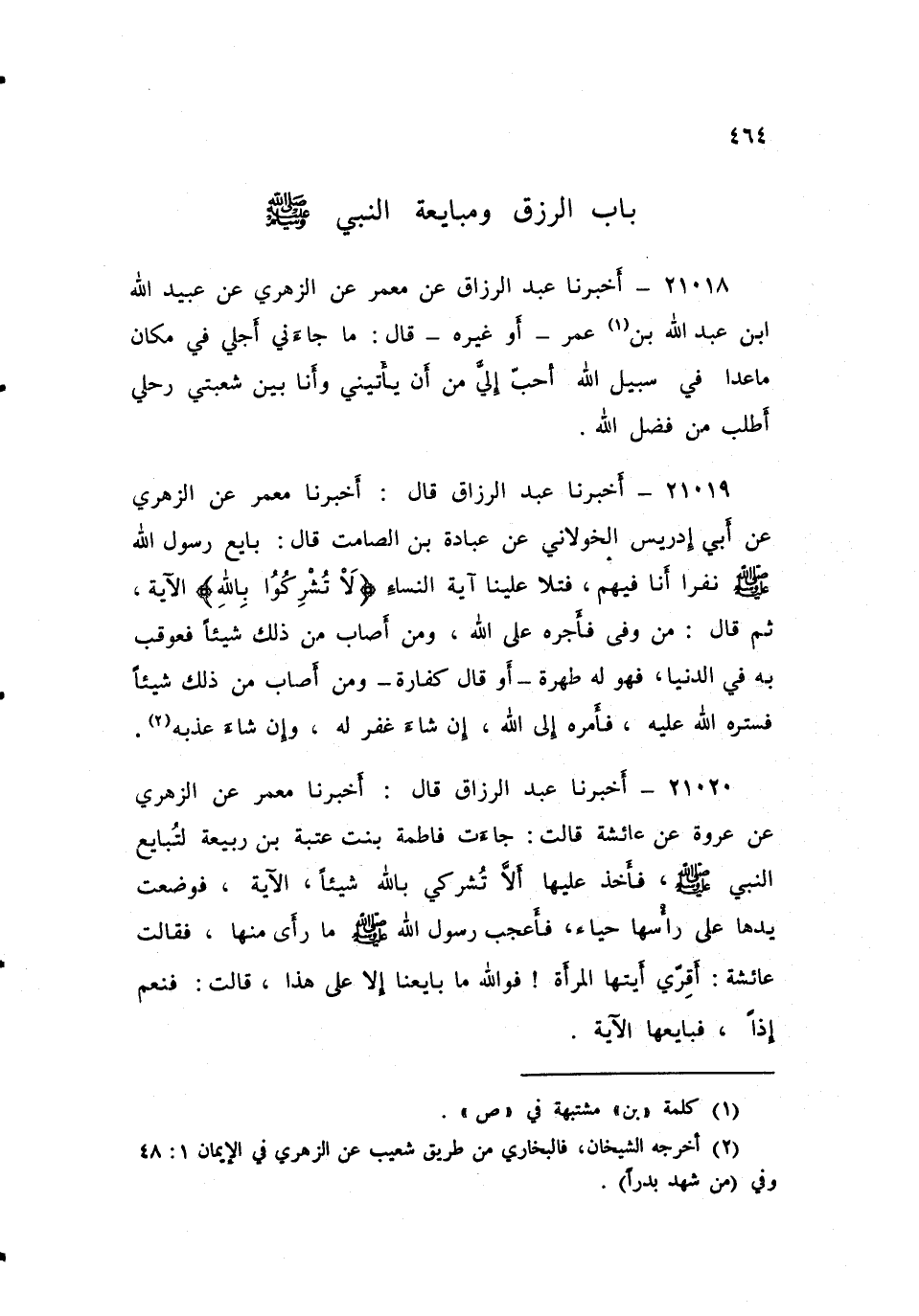 ٢١٠٢٠ - أَخْبَرَنَا عَبْدُ الرَّزَّاقِ، قَالَ أَخْبَرَنَا مَعْمَرٌ، عَنِ الزُّهْرِيِّ، عَنْ عُرْوَةَ، عَنْ عَائِشَةَ قَالَتْ: «جَاءَتْ فَاطِمَةُ بِنْتُ عُتْبَةَ بْنِ رَبِيعَةَ لِتُبَايِعَ النَّبِيَّ صَلَّى اللهُ عَلَيْهِ وَسَلَّمَ، فَأَخَذَ عَلَيْهَا أَلَّا تُشْرِكِي بِاللَّهِ شَيْئًا» الْآيَةَ، فَوَضَعَتْ يَدَهَا عَلَى رَأْسِهَا حَيَاءً، فَأَعْجَبَ رَسُولَ اللَّهِ صَلَّى اللهُ عَلَيْهِ وَسَلَّمَ مَا رَأَى مِنْهَا، فَقَالَتْ عَائِشَةُ: أَقِرِّي أَيَّتُهَا الْمَرْأَةُ، فَوَاللَّهِ مَا بَايَعْنَا إِلَّا عَلَى هَذَا، قَالَتْ: فَنَعَمْ إِذًا، فَبَايَعَهَا الْآيَةَ