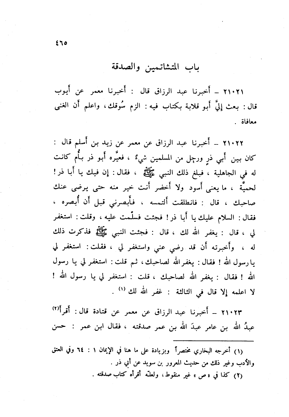 ٢١٠٢٢ - أَخْبَرَنَا عَبْدُ الرَّزَّاقِ، عَنْ مَعْمَرٍ، عَنْ زَيْدِ بْنِ أَسْلَمَ، قَالَ: كَانَ بَيْنَ أَبِي ذَرٍّ وَرَجُلٍ مِنَ الْمُسْلِمِينَ شَيْءٌ، فَعَيَّرَهُ أَبُو ذَرٍّ بِأُمٍّ كَانَتْ لَهُ فِي الْجَاهِلِيَّةِ، فَبَلَغَ ذَلِكَ النَّبِيَّ صَلَّى اللهُ عَلَيْهِ وَسَلَّمَ، فَقَالَ: «إِنَّ فِيكَ يَا أَبَا ذَرٍّ لَحَمِيَّةً، مَا يَعْنِي أَسْوَدُ وَلَا أَخْضَرُ أَنْتَ خَيْرٌ مِنْهُ حَتَّى يَرْضَى عَنْكَ صَاحِبُكَ» قَالَ: فَانْطَلَقْتُ أَلْتَمِسُهُ فَأَبْصَرَنِي قَبْلَ أَنْ أُبْصِرَهُ، فَقَالَ: السَّلَامُ عَلَيْكَ يَا أَبَا ذَرٍّ فَجِئْتُ فَسَلَّمْتُ عَلَيْهِ، وَقُلْتُ: اسْتَغْفِرْ لِي، قَالَ: يَغْفِرُ اللَّهُ لَكَ، قَالَ: فَجِئْتُ النَّبِيَّ صَلَّى اللهُ عَلَيْهِ وَسَلَّمَ، فَذَكَرْتُ ذَلِكَ لَهُ، وَأَخْبَرْتُهُ أَنْ قَدْ رَضِيَ عَنِّي وَاسْتَغْفَرَ لِي، فَقُلْتُ: اسْتَغْفِرْ لِي يَا رَسُولَ اللَّهِ، فَقَالَ: «يَغْفِرُ اللَّهُ لِصَاحِبِكَ» ثُمَّ قُلْتُ: اسْتَغْفِرْ لِي يَا رَسُولَ اللَّهِ، فَقَالَ: «يَغْفِرُ اللَّهُ لِصَاحِبِكَ» ، قُلْتُ اسْتَغْفِرْ لِي يَا رَسُولَ اللَّهِ، لَا أَعْلَمُهُ إِلَّا قَالَ فِي الثَّالِثَةِ: «غَفَرَ اللَّهُ لَكَ»