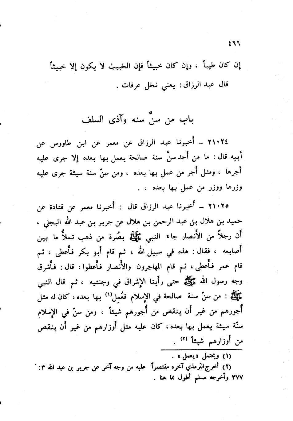 ٢١٠٢٥ - أَخْبَرَنَا عَبْدُ الرَّزَّاقِ، قَالَ أَخْبَرَنَا مَعْمَرٌ، عَنْ قَتَادَةَ، عَنْ حُمَيْدِ بْنِ هِلَالٍ، عَنْ عَبْدِ الرَّحْمَنِ بْنِ هِلَالٍ، عَنْ جَرِيرِ بْنِ عَبْدِ اللَّهِ الْبَجَلِيِّ: أَنَّ رَجُلًا مِنَ الْأَنْصَارِ جَاءَ النَّبِيَّ صَلَّى اللهُ عَلَيْهِ وَسَلَّمَ بِصُرَّةٍ مِنْ ذَهَبٍ تَمْلَأُ مَا بَيْنَ أَصَابِعِهِ، فَقَالَ: هَذِهِ فِي سَبِيلِ اللَّهِ، ثُمَّ قَامَ أَبُو بَكْرٍ فَأَعْطَى، ثُمَّ قَامَ عُمَرُ فَأَعْطَى، ثُمَّ قَامَ الْمُهَاجِرُونَ وَالْأَنْصَارُ فَأَعْطَوْا، قَالَ: فَأَشْرَقَ وَجْهُ رَسُولِ اللَّهِ صَلَّى اللهُ عَلَيْهِ وَسَلَّمَ حَتَّى رَأَيْنَا الْإِشْرَاقَ فِي وَجْنَتَيْهِ، ثُمَّ قَالَ النَّبِيُّ صَلَّى اللهُ عَلَيْهِ وَسَلَّمَ: «مَنْ سَنَّ سُنَّةً صَالِحَةً فِي الْإِسْلَامِ فَعُمِلَ بِهَا بَعْدَهُ، كَانَ لَهُ مِثْلُ أُجُورِهِمْ مِنْ غَيْرِ أَنْ يَنْقُصَ مِنْ أُجُورِهِمْ شَيْئًا، وَمَنْ سَنَّ فِي الْإِسْلَامِ سُنَّةً سَيِّئَةً يُعْمَلُ بِهَا بَعْدَهُ، كَانَ عَلَيْهِ مِثْلُ أَوْزَارِهِمْ مِنْ غَيْرِ أَنْ يَنْقُصَ مِنْ أَوْزَارِهِمْ شَيْئًا»