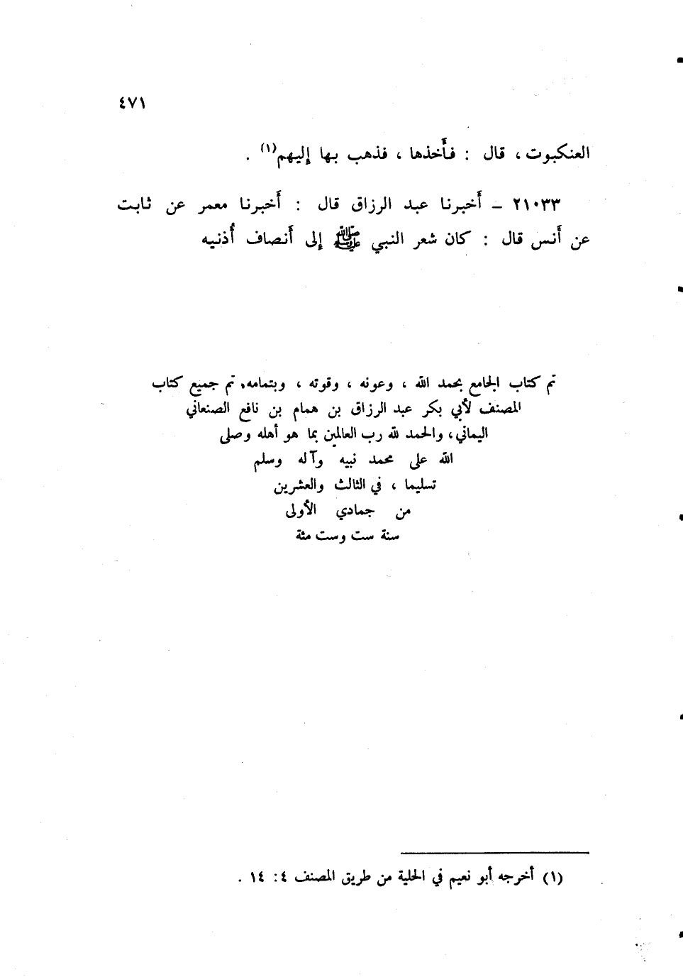 ٢١٠٣٣ - أَخْبَرَنَا عَبْدُ الرَّزَّاقِ، قَالَ أَخْبَرَنَا مَعْمَرٌ، عَنْ ثَابِتٍ، عَنِ أَنَسٍ، قَالَ: «كَانَ شَعْرُ النَّبِيِّ صَلَّى اللهُ عَلَيْهِ وَسَلَّمَ إِلَى أَنْصَافِ أُذُنَيْهِ»