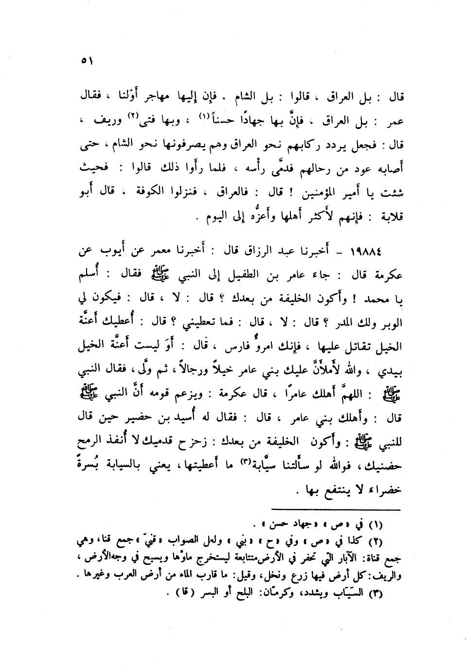 ١٩٨٨٤ - أَخْبَرَنَا عَبْدُ الرَّزَّاقِ، قَالَ: أَخْبَرَنَا مَعْمَرٌ، عَنْ أَيُّوبَ، عَنْ عِكْرِمَةَ، قَالَ: جَاءَ عَامِرُ بْنُ الطُّفَيْلِ إِلَى النَّبِيِّ صَلَّى اللهُ عَلَيْهِ وَسَلَّمَ فَقَالَ: أُسْلِمُ يَا مُحَمَّدُ وَأَكُونُ الْخَلِيفَةَ مِنْ بَعْدِكَ؟ قَالَ: «لَا» ، قَالَ: فَيَكُونُ لِي الْوَبَرُ وَلَكَ الْمَدَرُ؟ قَالَ: «لَا» ، قَالَ: «فَمَا تُعْطِينِي؟» ، قَالَ: أُعْطِيكَ أَعِنَّةَ الْخَيْلِ تُقَاتِلُ عَلَيْهَا، فَإِنَّكَ امْرُؤٌ فَارِسٌ، قَالَ: أَوَلَيْسَتْ أَعِنَّةُ الْخَيْلِ بِيَدِي؟ وَاللَّهِ لَأَمْلَأَنَّ عَلَيْكَ بَنِي عَامِرٍ خَيْلًا، وَرِجَالًا، ثُمَّ وَلَّى، فَقَالَ النَّبِيُّ صَلَّى اللهُ عَلَيْهِ وَسَلَّمَ: «اللَّهُمَّ أَهْلِكْ عَامِرًا» ، قَالَ عِكْرِمَةُ: وَيَزْعُمُ قَوْمُهُ أَنَّ النَّبِيَّ صَلَّى اللهُ عَلَيْهِ وَسَلَّمَ قَالَ: «وَأَهْلِكْ بَنِي عَامِرٍ» ، قَالَ: فَقَالَ لَهُ أُسَيْدُ بْنُ حُضَيْرٍ حِينَ قَالَ لِلنَّبِيِّ صَلَّى اللهُ عَلَيْهِ وَسَلَّمَ: وَأَكُونُ الْخَلِيفَةَ مِنْ بَعْدِكَ: زَحْزِحْ قَدَمَيْكَ لَا أُنْفِذَ الرُّمْحَ حُضْنَيْكَ، فَوَاللَّهِ لَوْ سَأَلْتَنَا سَيَابَةً مَا أُعْطِيتَهَا، «يَعْنِي بِالسَّيَابَةِ: بُسْرَةً خَضْرَاءَ لَا يُنْتَفَعُ بِهَا»