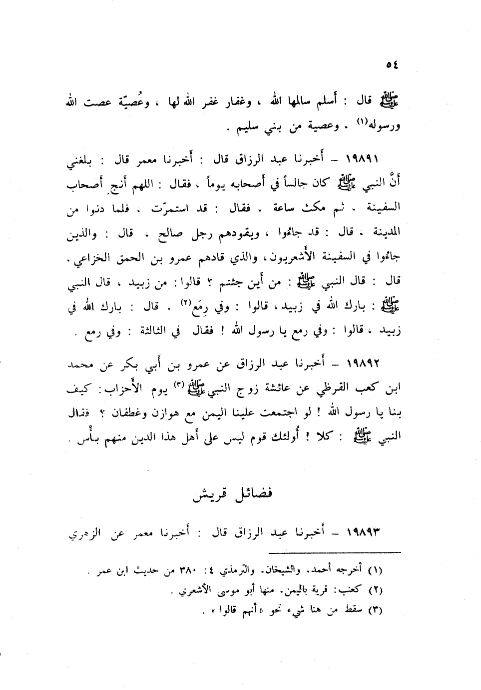 ١٩٨٩١ - أَخْبَرَنَا عَبْدُ الرَّزَّاقِ، قَالَ: أَخْبَرَنَا مَعْمَرٌ، قَالَ: بَلَغَنِي أَنَّ النَّبِيَّ صَلَّى اللهُ عَلَيْهِ وَسَلَّمَ كَانَ جَالِسًا فِي أَصْحَابِهِ يَوْمًا، فَقَالَ: «اللَّهُمَّ أَنْجِ أَصْحَابَ السَّفِينَةِ» ، ثُمَّ مَكَثَ سَاعَةً، فَقَالَ: «قَدِ اسْتَمَرَّتْ» ، فَلَمَّا دَنَوْا مِنَ الْمَدِينَةِ قَالَ: «قَدْ جَاءُوا وَيَقُودُهُمْ رَجُلٌ صَالِحٌ» ، قَالَ: وَالَّذِينَ جَاءُوا فِي السَّفِينَةِ الْأَشْعَرِيُّونَ، وَالَّذِي قَادَهُمْ عَمْرُو بْنُ الْحَمِقِ الْخُزَاعِيُّ، قَالَ: قَالَ النَّبِيُّ صَلَّى اللهُ عَلَيْهِ وَسَلَّمَ: «مِنْ أَيْنَ جِئْتُمْ؟» ، قَالُوا: مِنْ زُبَيْدٍ، قَالَ النَّبِيُّ صَلِّي اللَّهُ عَلَيْهِ وَسَلَّمَ: «بَارَكَ اللَّهُ فِي زُبَيْدٍ» ، قَالُوا: وَفِي رِمَعٍ، قَالَ: «بَارَكَ اللَّهُ فِي زُبَيْدٍ» ، قَالُوا: وَفِي رِمَعٍ يَا رَسُولَ اللَّهِ، فَقَالَ فِي الثَّالِثَةِ: «وَفِي رِمَعٍ»