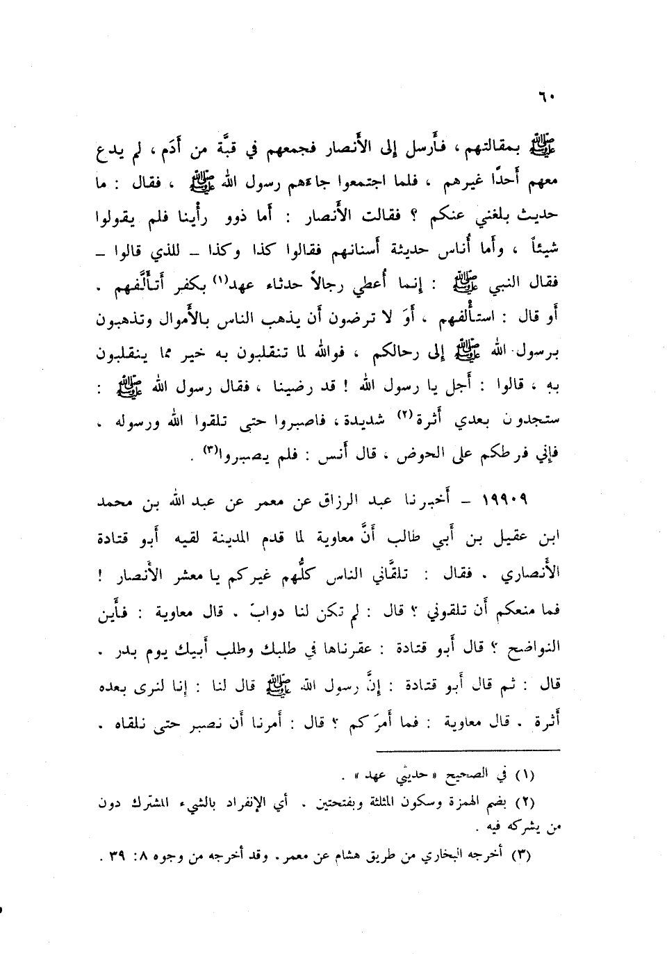 ١٩٩٠٩ - أَخْبَرَنَا عَبْدُ الرَّزَّاقِ، عَنْ مَعْمَرٍ، عَنْ عَبْدِ اللَّهِ بْنِ مُحَمَّدِ بْنِ عَقِيلِ بْنِ أَبِي طَالِبٍ، أَنَّ مُعَاوِيَةَ، لَمَّا قَدِمَ الْمَدِينَةَ لَقِيَهُ أَبُو قَتَادَةَ الْأَنْصَارِيُّ، فَقَالَ: تَلَقَّانِي النَّاسُ كُلُّهُمْ غَيْرَكُمْ يَا مَعْشَرَ الْأَنْصَارِ، فَمَا مَنَعَكُمْ أَنْ تَلْقَوْنِي؟ قَالَ: لَمْ تَكُنْ لَنَا دَوَابُّ، قَالَ مُعَاوِيَةُ: فَأَيْنَ النَّوَاضِحُ؟ قَالَ أَبُو قَتَادَةَ: عَقَرْنَاهَا فِي طَلَبِكَ، وَطَلَبِ أَبِيكَ يَوْمَ بَدْرٍ، قَالَ: ثُمَّ قَالَ أَبُو قَتَادَةَ: إِنَّ رَسُولَ اللَّهِ صَلَّى اللهُ عَلَيْهِ وَسَلَّمَ قَالَ لَنَا: «إِنَّا لَنَرَى بَعْدَهُ أَثَرَةً» ، قَالَ مُعَاوِيَةُ: فَمَا أَمَرَكُمْ؟ قَالَ: «أَمَرَنَا أَنْ نَصْبِرَ حَتَّى نَلْقَاهُ» ، ⦗٦١⦘ قَالَ: فَاصْبِرُوا حَتَّى تَلْقَوْهُ، قَالَ: فَقَالَ عَبْدُ الرَّحْمَنِ بْنُ حَسَّانَ حِينَ بَلَغَهُ ذَلِكَ: