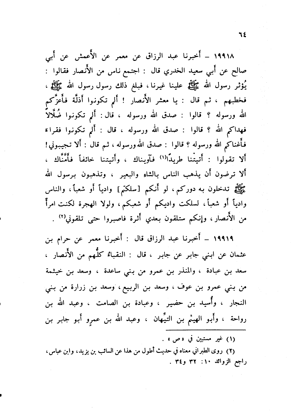 ١٩٩١٨ - أَخْبَرَنَا عَبْدُ الرَّزَّاقِ، عَنْ مَعْمَرٍ، عَنِ الْأَعْمَشِ، عَنْ أَبِي صَالِحٍ، عَنْ أَبِي سَعِيدٍ الْخُدْرِيِّ، قَالَ: اجْتَمَعَ نَاسٌ مِنَ الْأَنْصَارِ فَقَالُوا: يُؤْثِرُ رَسُولُ اللَّهِ صَلَّى اللهُ عَلَيْهِ وَسَلَّمَ عَلَيْنَا غَيْرَنَا، فَبَلَغَ ذَلِكَ رَسُولَ اللَّهِ صَلَّى اللهُ عَلَيْهِ وَسَلَّمَ، فَخَطَبَهُمْ، ثُمَّ قَالَ: «يَا مَعْشَرَ الْأَنْصَارِ، أَلَمْ تَكُونُوا أَذِلَّةً فَأَعَزَّكُمُ اللَّهُ وَرَسُولُهُ؟» ، قَالُوا: صَدَقَ اللَّهُ وَرَسُولُهُ، قَالَ: «أَلَمْ تَكُونُوا ضُلَّالًا، فَهَدَاكُمُ اللَّهُ؟» ، قَالُوا: صَدَقَ اللَّهُ وَرَسُولُهُ، قَالَ: «أَلَمْ تَكُونُوا فُقَرَاءَ فَأَغْنَاكُمُ اللَّهُ وَرَسُولُهُ؟» ، قَالُوا: صَدَقَ اللَّهُ وَرَسُولُهُ، ثُمَّ قَالَ: «أَلَا تُجِيبُونِي؟ أَلَا تَقُولُوا: أَتَيْتَنَا طَرِيدًا فَآوَيْنَاكَ، وَأَتَيْتَنَا خَائِفًا فَأَمَّنَّاكَ، أَلَا تَرْضَوْنَ أَنْ يَذْهَبَ النَّاسُ بِالشَّاءِ وَالْبَعِيرِ، وَتَذْهَبُونَ بِرَسُولِ اللَّهِ صَلَّى اللهُ عَلَيْهِ وَسَلَّمَ، تَدْخُلُونَ بِهِ دُورَكُمْ، لَوْ أَنَّكُمْ سَلَكْتُمْ وَادِيًا - أَوْ شِعْبًا - وَالنَّاسُ وَادِيًا - أَوْ شِعْبًا - لَسَلَكْتُ وَادِيَكُمْ - أَوْ شِعْبَكُمْ - وَلَوْلَا الْهِجْرَةُ لَكُنْتُ امْرَأً مِنَ الْأَنْصَارِ، وَإِنَّكُمْ سَتَلْقَوْنَ بَعْدِي أَثَرَةً، فَاصْبِرُوا حَتَّى تَلْقَوْنِي»