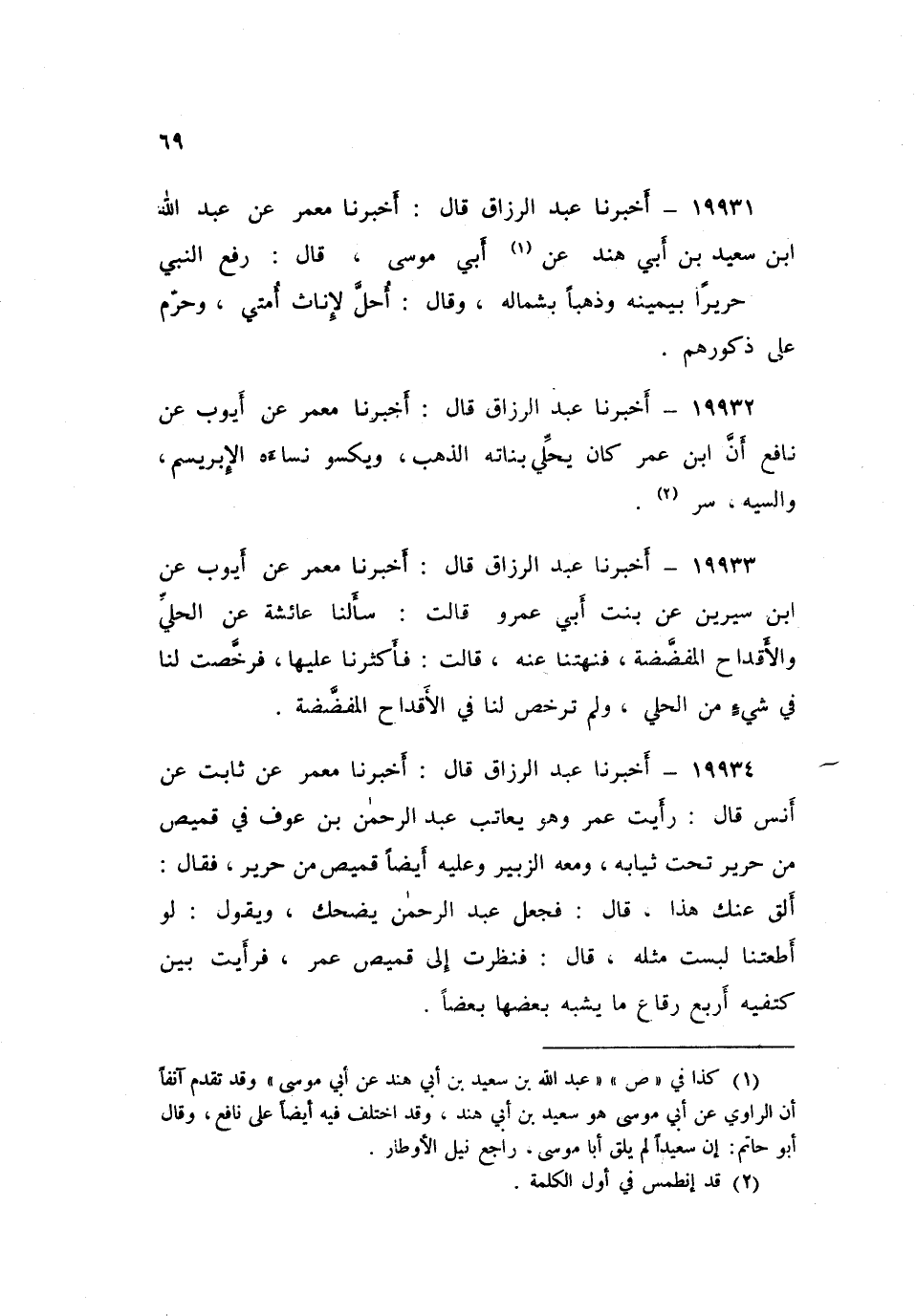 ١٩٩٣٢ - أَخْبَرَنَا عَبْدُ الرَّزَّاقِ، قَالَ: أَخْبَرَنَا مَعْمَرٌ، عَنْ أَيُّوبَ، عَنْ نَافِعٍ، «أَنَّ ابْنَ عُمَرَ، كَانَ يُحَلِّي بَنَاتِهِ الذَّهَبَ، وَيَكسُو نِسَاءَهُ الْإِبْرَيْسَمَ، وَالسِّيهُ سِرٌّ»