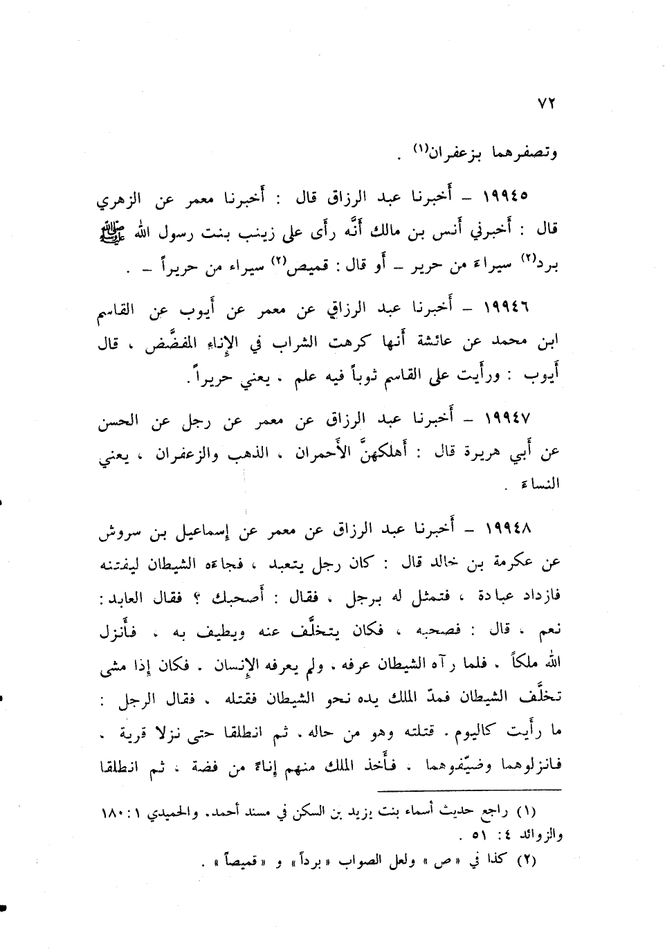 ١٩٩٤٥ - أَخْبَرَنَا عَبْدُ الرَّزَّاقِ، قَالَ: أَخْبَرَنَا مَعْمَرٌ، عَنِ الزُّهْرِيِّ، قَالَ: أَخْبَرَنِي أَنَسُ بْنُ مَالِكٍ، أَنَّهُ «رَأَى عَلَى زَيْنَبَ بِنْتِ رَسُولِ اللَّهِ صَلَّى اللهُ عَلَيْهِ وَسَلَّمَ بُرْدًا سِيَرَاءَ مِنْ حَرِيرٍ» أَوْ قَالَ: «قَمِيصًا سِيَرَاءَ مِنْ حَرِيرٍ»
