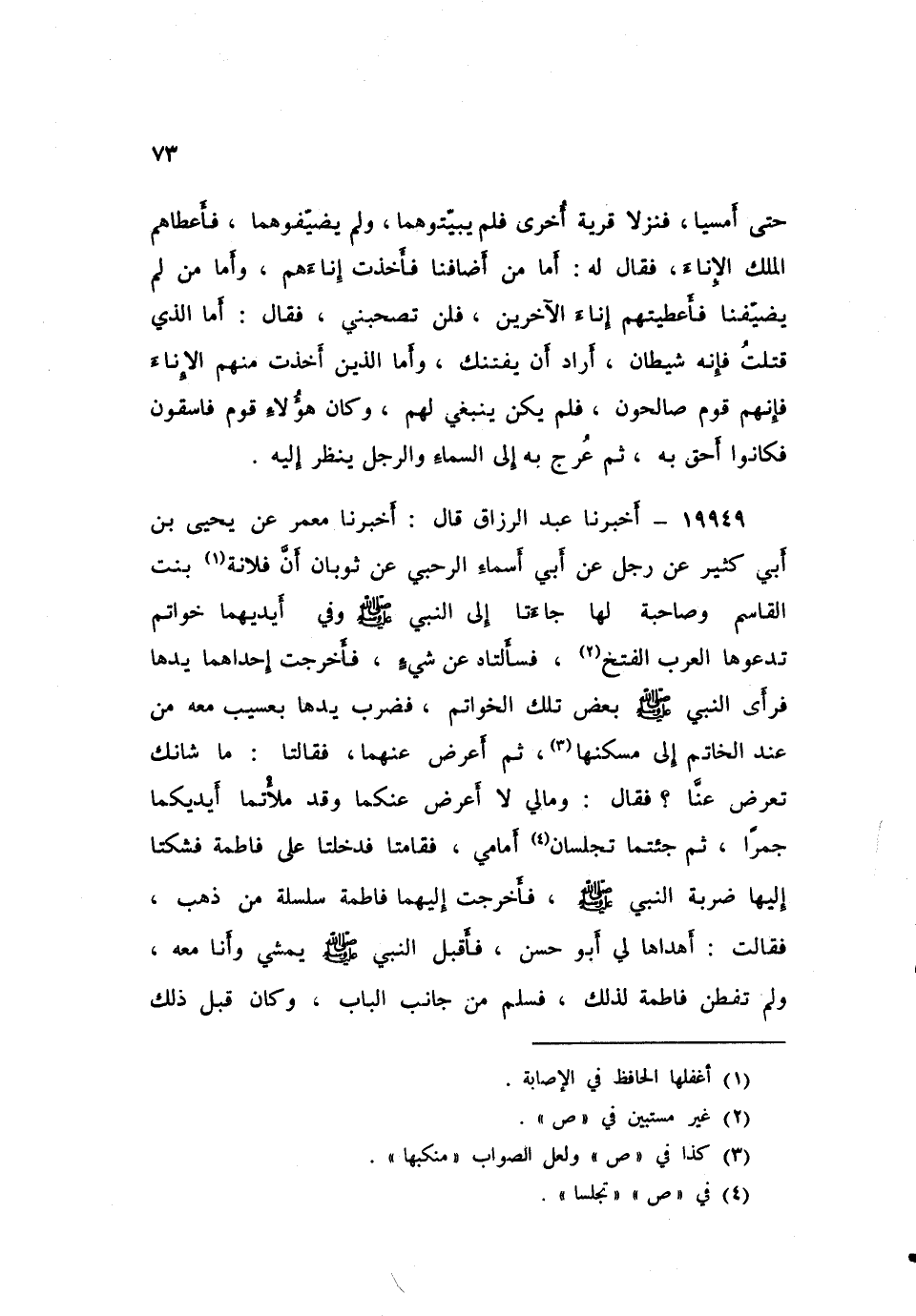 ١٩٩٤٩ - أَخْبَرَنَا عَبْدُ الرَّزَّاقِ، قَالَ: أَخْبَرَنَا مَعْمَرٌ، عَنْ يَحْيَى بْنِ أَبِي كَثِيرٍ، عَنْ رَجُلٍ، عَنْ أَبِي أَسْمَاءَ الرَّحَبِيِّ، عَنْ ثَوْبَانَ، أَنَّ فُلَانَةَ بِنْتَ الْقَاسِمِ، وَصَاحِبَةً لَهَا جَاءَتَا إِلَى النَّبِيِّ صَلَّى اللهُ عَلَيْهِ وَسَلَّمَ، وَفِي أَيْدِيهِمَا خَوَاتِمُ، تَدَعُوهَا الْعَرَبُ: الْفَتَخَ، فَسَأَلتَاهُ عَنْ شَيْءٍ، فَأَخْرَجَتْ إِحْدَاهُمَا يَدَهَا، فَرَأَى النَّبِيُّ صَلَّى اللهُ عَلَيْهِ وَسَلَّمَ بَعْضَ تِلْكَ الْخَوَاتِمِ، فَضَرَبَ يَدَهَا بِعَسِيبٍ مَعَهُ مِنْ عِنْدِ الْخَاتَمِ إِلَى مِنْكَبِهَا، ثُمَّ أَعْرَضَ عَنْهُمَا، فَقَالَتَا: مَا شَأْنُكَ تُعْرِضُ عَنَّا؟ فَقَالَ: «وَمَا لِي لَا أُعْرِضُ عَنْكُمَا، وَقَدْ مَلَأْتُمَا أَيْدِيَكُمَا جَمْرًا، ثُمَّ جِئْتُمَا تَجْلِسَانِ أَمَامِي» ، فَقَامَتَا فَدَخَلَتَا عَلَى فَاطِمَةَ، فَشَكَتَا إِلَيْهَا ضَرْبَةَ النَّبِيِّ صَلَّى اللهُ عَلَيْهِ وَسَلَّمَ، فَأَخْرَجَتْ إِلَيْهِمَا فَاطِمَةُ سِلْسِلَةً مِنْ ذَهَبٍ، فَقَالَتْ: أَهْدَاهَا لِي أَبُو حَسَنٍ، فَأَقْبَلَ النَّبِيُّ صَلَّى اللهُ عَلَيْهِ وَسَلَّمَ يَمْشِي وَأَنَا مَعَهُ، وَلَمْ تَفْطِنْ فَاطِمَةُ لِذَلِكَ، فَسَلَّمَ مِنْ جَانِبِ الْبَابِ، وَكَانَ قَبْلَ ذَلِكَ ⦗٧٤⦘ يَأْتِي الْبَابَ مِنْ قِبَلِ وَجْهِهِ، فَاسْتَأْذَنَ فَأُذِنَ لَهُ، وَأَلْقَتْ لَهُ فَاطِمَةُ ثَوْبًا، فَجَلَسَ عَلَيْهِ، وَفِي يَدِهَا أَوْ عُنُقِهَا تِلْكَ السِّلْسِلَةُ، فَقَالَ: «أَيَغُرَّنَّكِ أَنْ يَقُولَ النَّاسُ: إِنَّكِ ابْنَةُ رَسُولِ اللَّهِ صَلَّى اللهُ عَلَيْهِ وَسَلَّمَ، وَفِي يَدِكِ - أَوْ عُنُقِكِ - طَبَقٌ مِنْ نَارٍ» ، وَعَرَمَهَا بِلِسَانِهِ، فَهَملَتْ عَيْنَاهَا، وَخَرَجَ النَّبِيُّ صَلَّى اللهُ عَلَيْهِ وَسَلَّمَ لَمْ يَجْلِسْ، فَأَرْسَلَتْ فَاطِمَةُ إِنْسَانًا مِنْ أَهْلِهَا، فَقَالَتْ: بِعْهَا بِمَا أُعْطِيتَ، فَبَاعَهَا بِوَصِيفٍ، فَجَاءَ بِهِ إِلَيْهَا، فَأَعْتَقَتْهُ، فَأَرْسَلُوا إِلَى رَسُولِ اللَّهِ صَلَّى اللهُ عَلَيْهِ وَسَلَّمَ، فأَخْبَرَوهُ خَبَرَ الطَّوْقِ، فَقَالَ: «الْحَمْدُ لِلَّهِ الَّذِي أَنْجَى فَاطِمَةَ مِنَ النَّارِ»