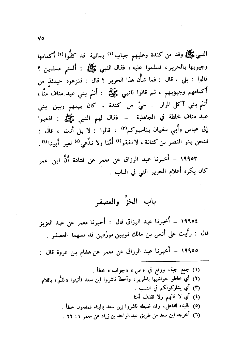 ١٩٩٥٤ - أَخْبَرَنَا عَبْدُ الرَّزَّاقِ، قَالَ: أَخْبَرَنَا مَعْمَرٌ، عَنْ عَبْدِ الْعَزِيزِ، قَالَ: «رَأَيْتُ عَلَى أَنَسِ بْنِ مَالِكٍ ثَوْبَيْنِ مُوَرَّدَيْنِ قَدْ مَسَّهُمَا الْعُصْفُرُ»