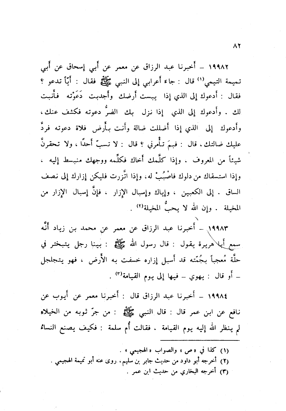 ١٩٩٨٢ - أَخْبَرَنَا عَبْدُ الرَّزَّاقِ، عَنْ مَعْمَرٍ، عَنْ أَبِي إِسْحَاقَ، عَنْ أَبِي تَمِيمَةَ التَّيْمِيِّ، قَالَ: جَاءَ أَعْرَابِيٌّ إِلَى النَّبِيِّ صَلَّى اللهُ عَلَيْهِ وَسَلَّمَ فَقَالَ: أَيًّا تَدْعُو؟ فَقَالَ: «أَدْعُوكَ إِلَى الَّذِي إِذَا يَبِسَتْ أَرْضُكَ وَأَجْدَبَتْ، دَعَوْتَهُ فَأَنْبَتَ لَكَ، وَأَدْعُوكَ إِلَى الَّذِي إِذَا نَزَلَ بِكَ الضُّرُّ دَعَوْتَهُ فَكَشَفَ عَنْكَ، وَأَدْعُوكَ إِلَى الَّذِي إِذَا أَضْلَلْتَ ضَالَّةً وَأَنْتَ بِأَرْضِ فَلَاةٍ دَعَوْتَهُ فَرَدَّ عَلَيْكَ ضَالَّتَكَ» ، قَالَ: فَبِمَ تَأْمُرُنِي؟ قَالَ: «لَا تَسُبَّ أَحَدًا، وَلَا تَحْقِرَنَّ شَيْئًا مِنَ الْمَعْرُوفِ، وَإِذَا كَلَّمْتَ أَخَاكَ فكَلِّمْهُ وَوَجْهُكَ مُنْبَسِطٌ إِلَيْهِ، وَإِذَا اسْتَسْقَاكَ مِنْ دَلْوِكَ، فَاصْبُبْ لَهُ، وَإِذَا اتَّزَرْتَ فَلْيَكُنْ إِزَارُكَ إِلَى نِصْفِ السَّاقِ إِلَى الْكَعْبَيْنِ، وَإِيَّاكَ وَإِسْبَالَ الْإِزَارِ، فَإِنَّ إِسْبَالَ الْإِزَارِ مِنَ الْمَخِيلَةِ، وَإِنَّ اللَّهَ لَا يُحِبُّ الْمَخِيلَةَ»