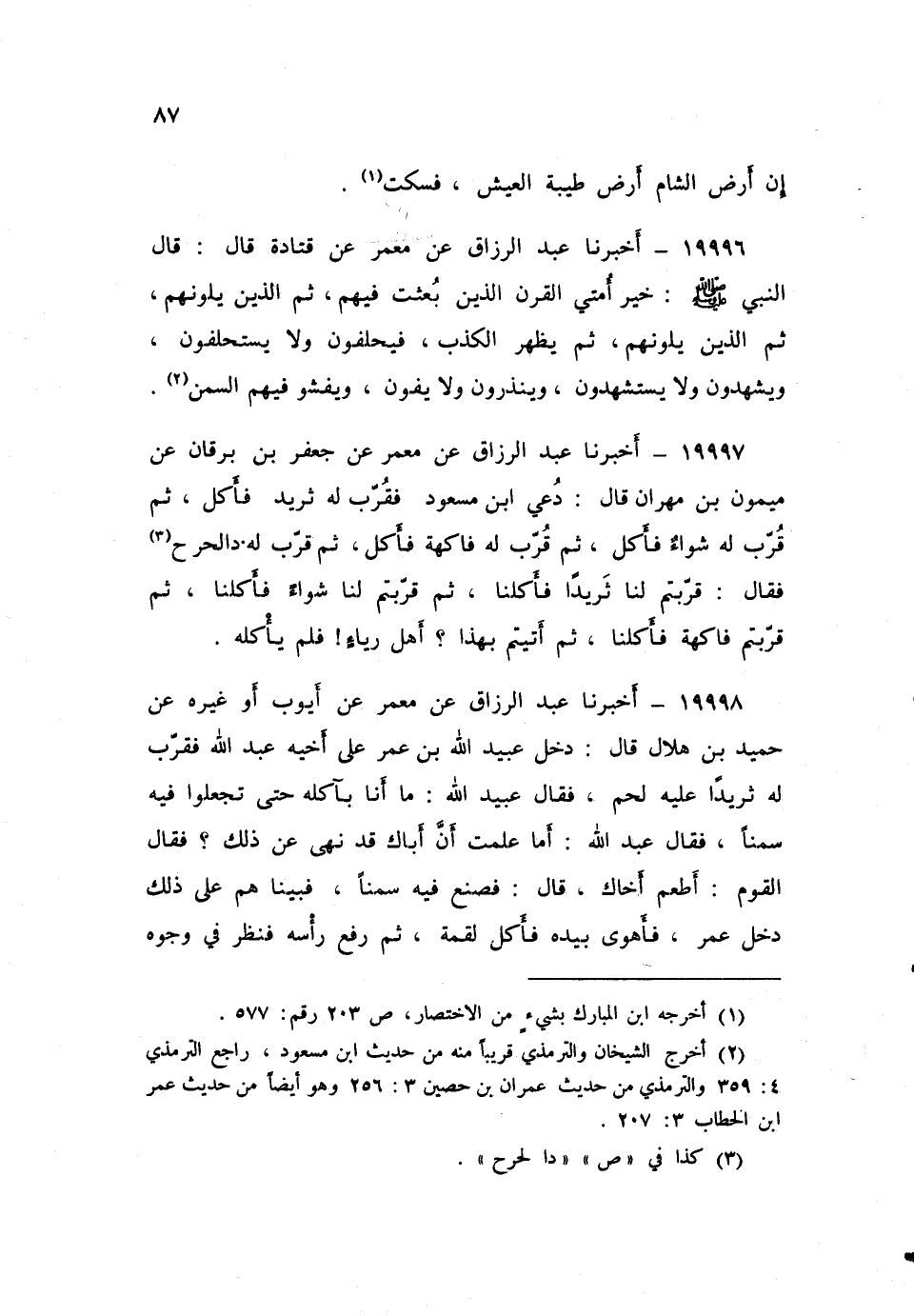 ١٩٩٩٨ - أَخْبَرَنَا عَبْدُ الرَّزَّاقِ، عَنْ مَعْمَرٍ، عَنْ أَيُّوبَ، أَوْ غَيْرِهِ، عَنْ حُمَيْدِ بْنِ هِلَالٍ، قَالَ: دَخَلَ عُبَيْدُ اللَّهِ بْنُ عُمَرَ عَلَى أَخِيهِ عَبْدِ اللَّهِ، فَقَرَّبَ لَهُ ثَرِيدًا عَلَيْهِ لَحْمٌ، فَقَالَ عُبَيْدُ اللَّهِ: مَا أَنَا بِآكِلِهِ حَتَّى تَجْعَلُوا فِيهِ سَمْنًا، فَقَالَ عَبْدُ اللَّهِ: «أَمَا عَلِمْتَ أَنَّ أَبَاكَ قَدْ نَهَى عَنْ ذَلِكَ؟ » فَقَالَ الْقَوْمُ: أَطْعِمْ أَخَاكَ، قَالَ: فَصَنَعَ فِيهِ سَمْنًا، فَبَيْنَا هُمْ عَلَى ذَلِكَ دَخَلَ عُمَرُ، فَأَهْوَى بِيَدِهِ، فَأَكَلَ لُقْمَةً، ثُمَّ رَفَعَ رَأْسَهُ فَنَظَرَ فِي وُجُوهِ الْقَوْمِ، ثُمَّ رَفَعَ الدِّرَّةَ فَضَرَبَ عُبَيْدَ اللَّهِ، ثُمَّ أَرَادَ أَنْ يَضْرِبَ الْجَارِيَةَ، فَقَالَتْ: مَا ذَنْبِي أَنَا مَأْمُورَةٌ، فَخَرَجَ وَلَمْ يَقُلْ لِعَبْدِ اللَّهِ شَيْئًا
