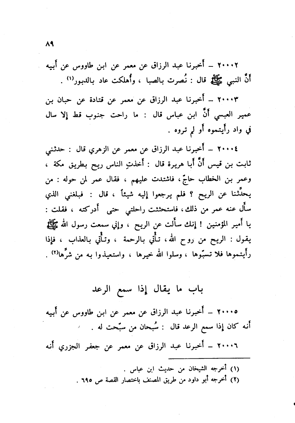 ٢٠٠٠٢ - أَخْبَرَنَا عَبْدُ الرَّزَّاقِ، عَنْ مَعْمَرٍ، عَنِ ابْنِ طَاوُسٍ، عَنْ أَبِيهِ، أَنَّ النَّبِيَّ صَلَّى اللهُ عَلَيْهِ وَسَلَّمَ قَالَ: «نُصِرْتُ بِالصَّبَا، وَأُهْلِكَتْ عَادٌ بِالدَّبُورِ»