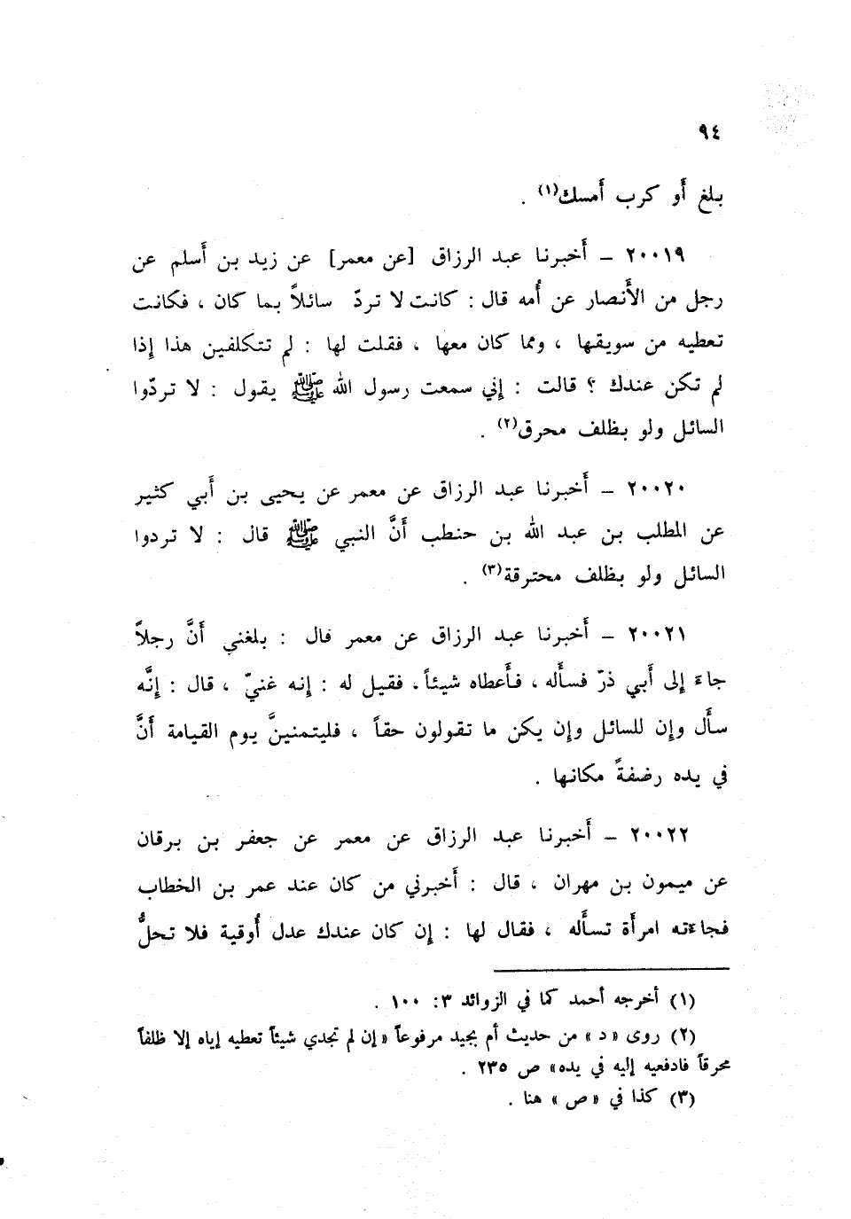 ٢٠٠١٩ - أَخْبَرَنَا عَبْدُ الرَّزَّاقِ، عَنْ مَعْمَرٍ، عَنْ زَيْدِ بْنِ أَسْلَمَ، عَنْ رَجُلٍ، مِنَ الْأَنْصَارِ، عَنِ أُمِّهِ، قَالَ: كَانَتْ لَا تَرُدُّ سَائِلًا بِمَا كَانَ، فَكَانَتْ تُعْطِيهِ مِنْ سَوِيقِهَا، وَمِمَّا كَانَ مَعَهَا، فَقُلْتُ لَهَا: لَمْ تَتَكَلَّفِينَ هَذَا إِذَا لَمْ تَكُنْ عِنْدَكَ؟ قَالَتْ: إِنِّي سَمِعْتُ رَسُولَ اللَّهِ صَلَّى اللهُ عَلَيْهِ وَسَلَّمَ يَقُولُ: «لَا تَرُدُّوا السَّائِلَ، وَلَوْ بِظِلْفٍ مُحْرَقٍ»